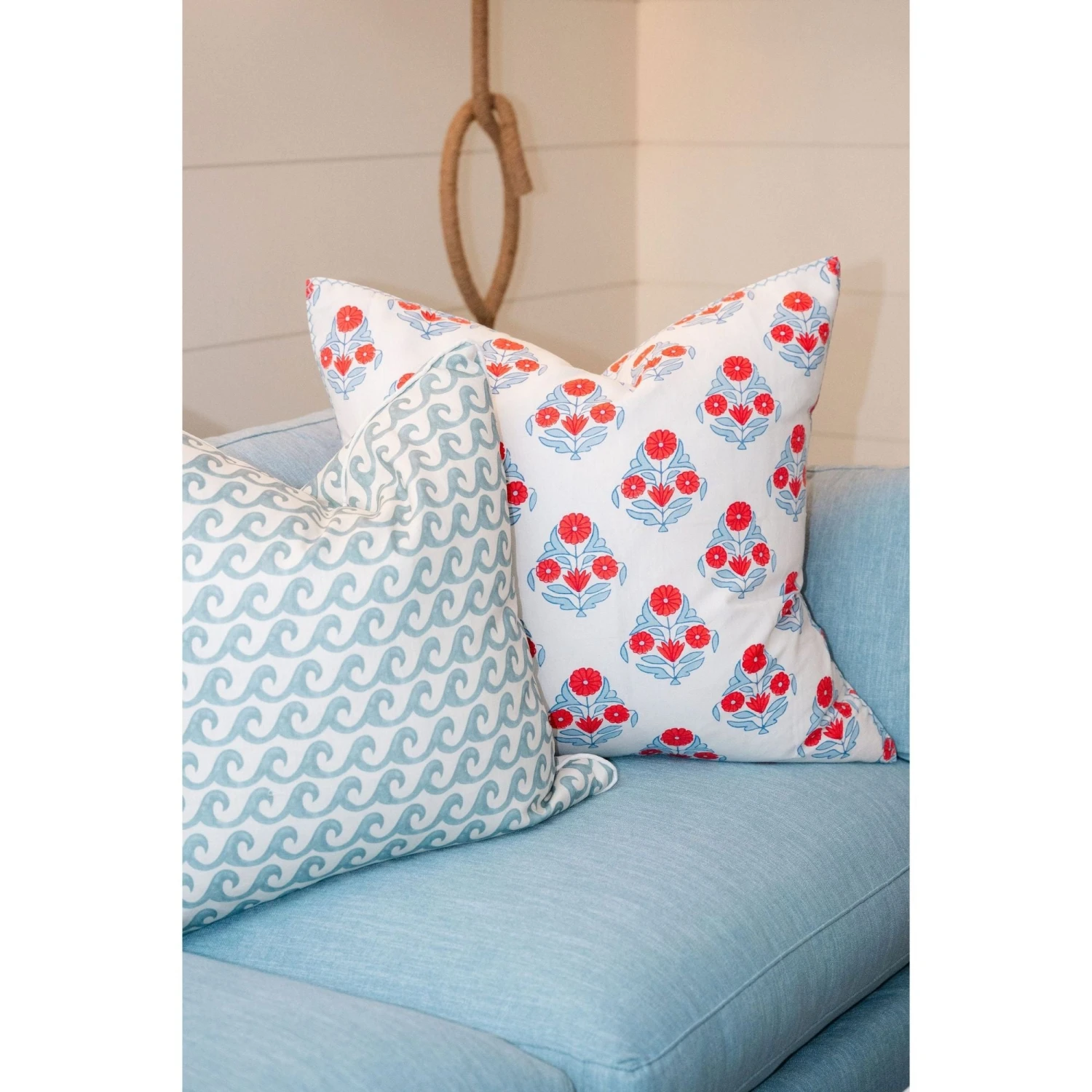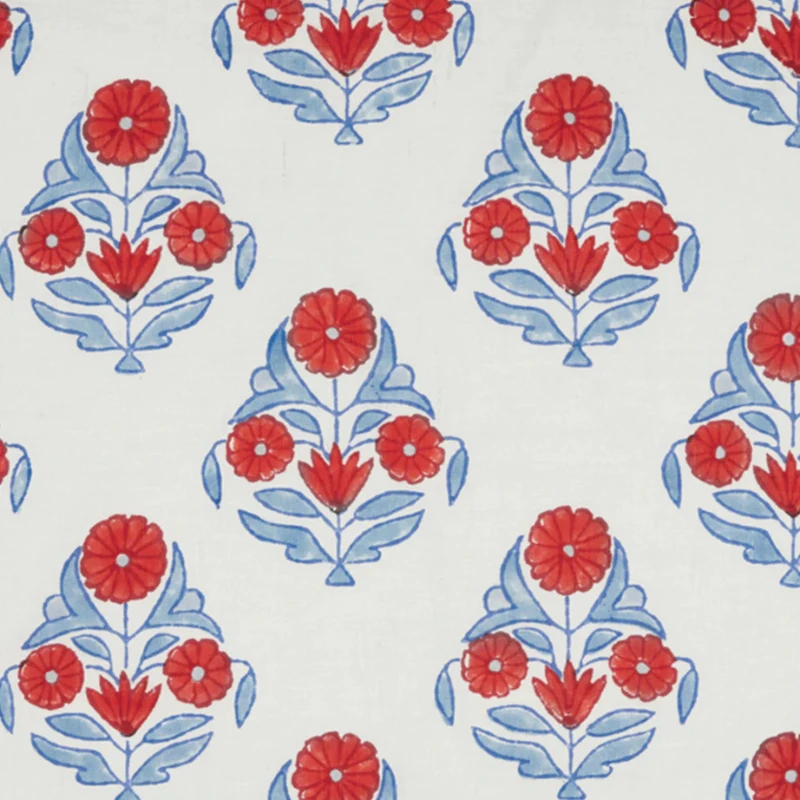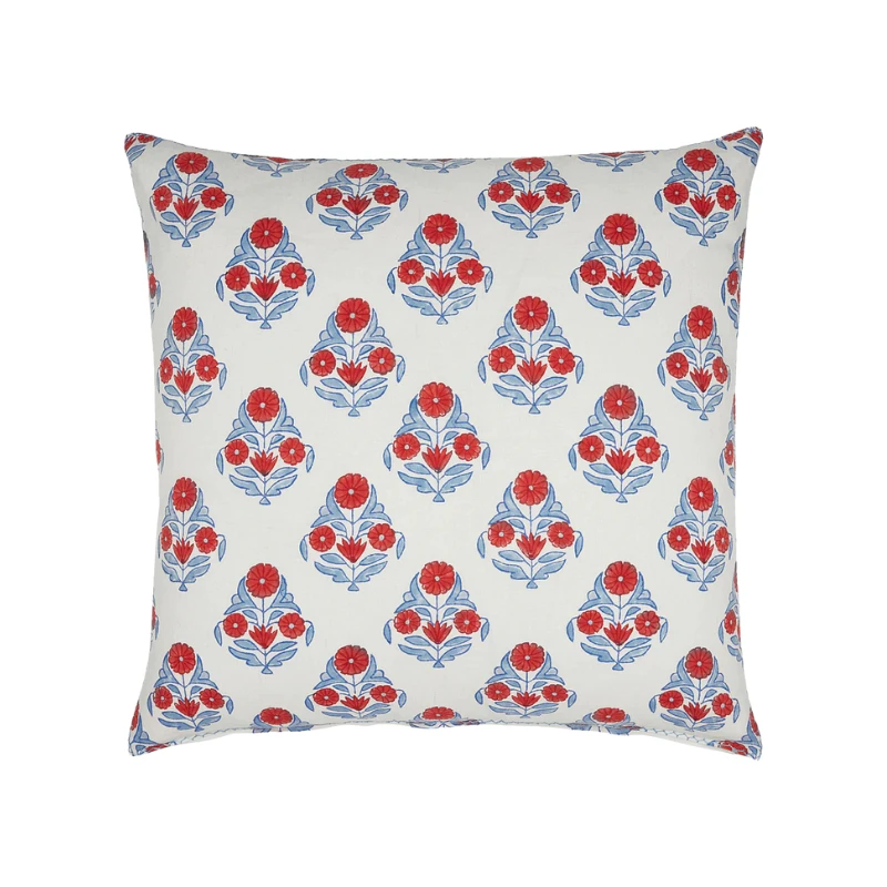 This vibrant hand block-printed pillow features stately florals blooming in coral red and soft indigo. The large-scale print brings bold, cheerful energy to any space, while the hand-stitched edging adds an artisanal touch. Printed on both sides and finished with a hidden zipper closure, it’s an effortless way to elevate your bed or sofa with timeless coastal charm.