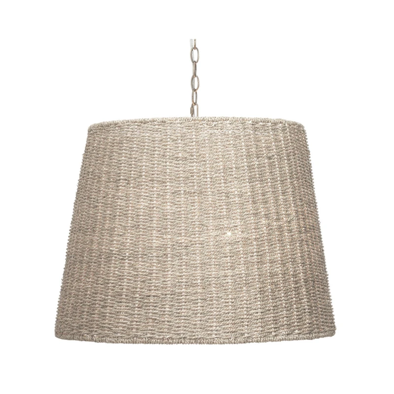 Our Nantucket Chandelier is an oversized fixture that adds organic texture and soft illumination to any space. A basket weave made from braided natural seagrass fibers creates a naturally opaque drum that softens and diffuses warm light. An antiqued brass chain allows this chandelier to transition from a casual or formal room. Natural seagrass finish will vary.