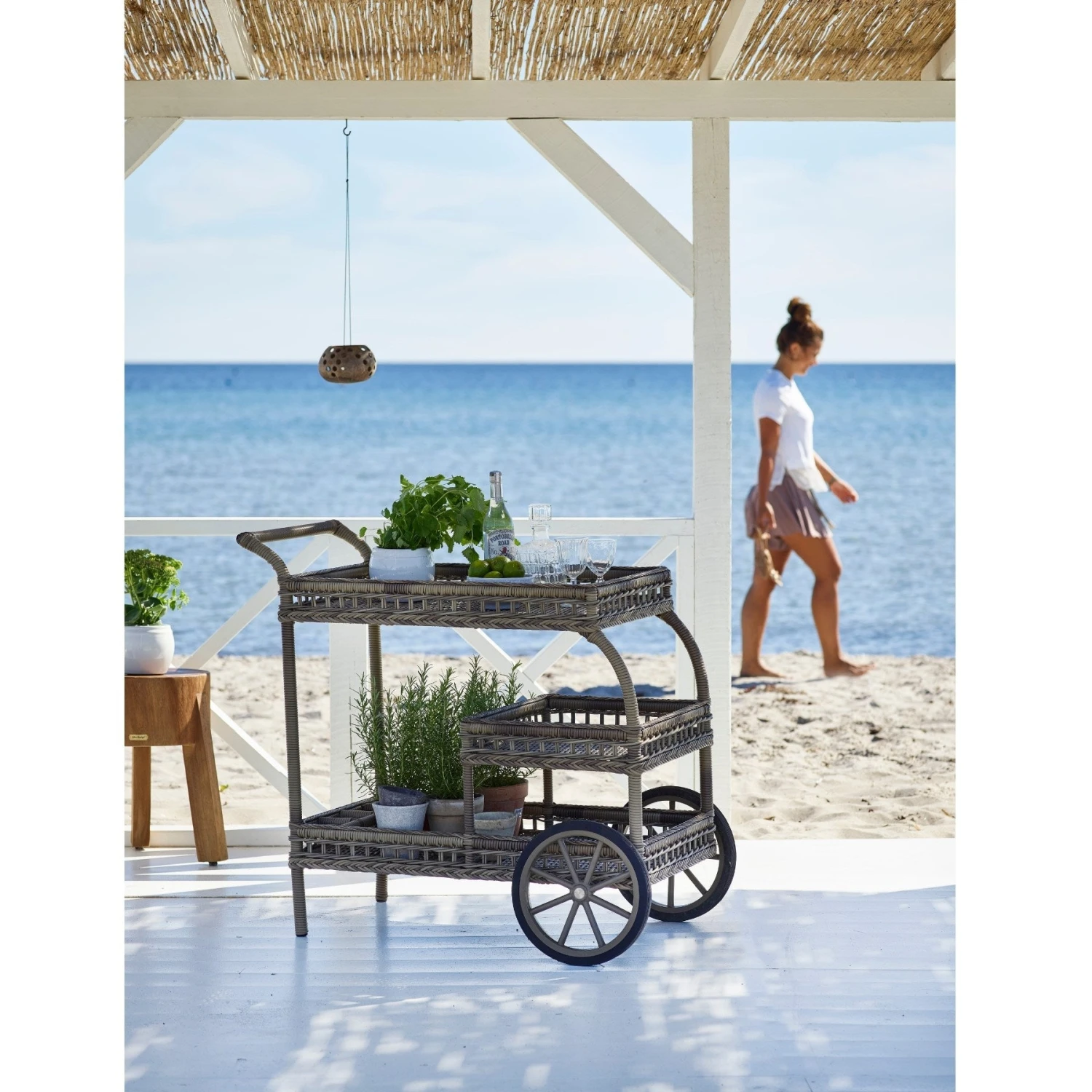Let the good times roll from the outdoor terrace to the poolside patio with our Napeague Indoor/Outdoor Bar Cart. Featuring a curved front and a trio of offset shelves for storing food and drinks and a prominent handle and two large wheels add vintage appeal and functionality. Designed to stand in the open air and make tea time or the evening cocktail hour more pleasurable, the aluminum cart showcases distinctive basket-woven shelves with herringbone woven details. This piece showcases flexible ArtFibre™ polyethylene bindings wrapped around a durable powder-coated aluminum AluRattan™ frame to withstand long-lasting outdoor use.
