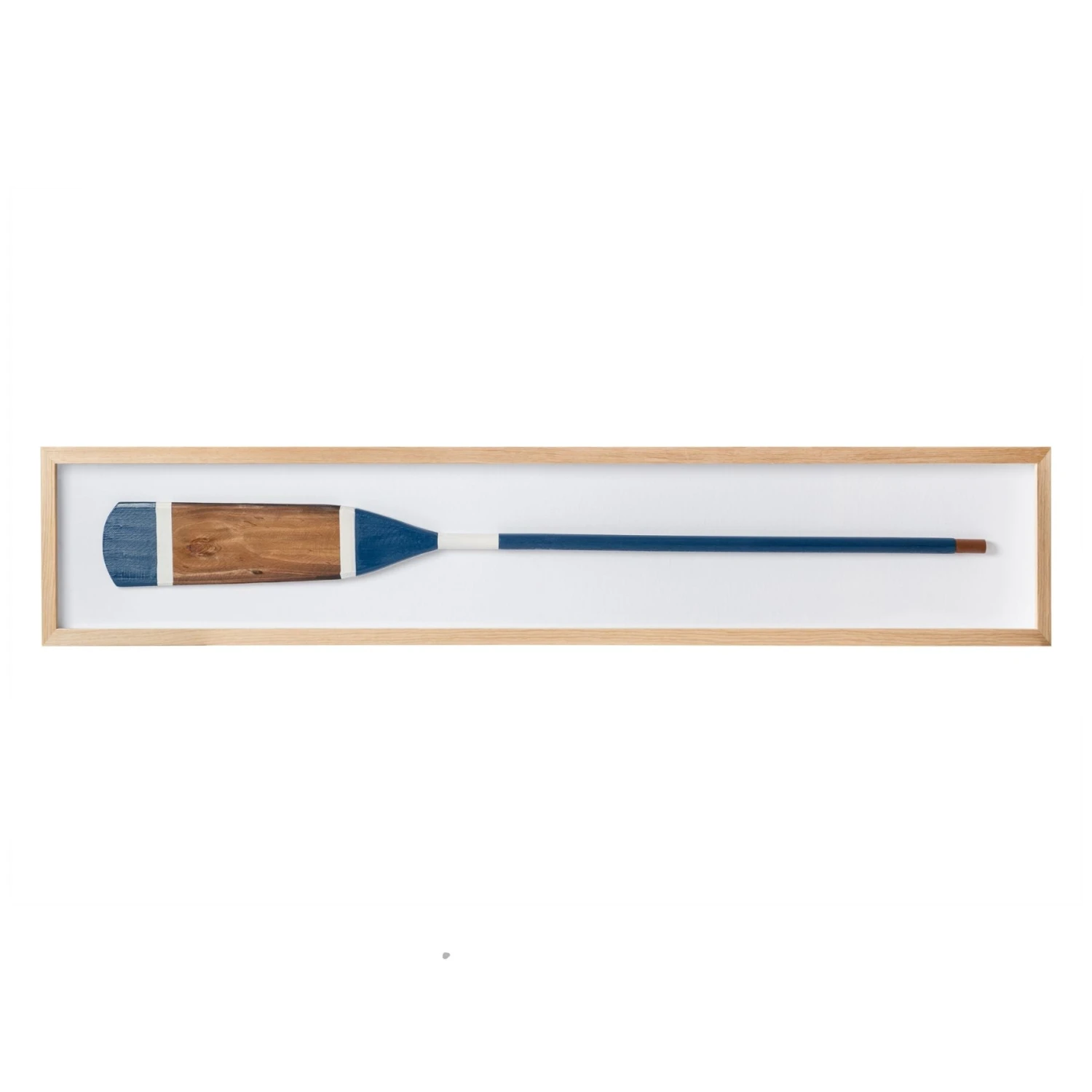 This nautical framed art features an authentic, hand-painted oar brimming with character. The blue tones create a stunning contrast with the natural wood grain, and the rustic style tells a tale of seafaring adventures. The oar is artfully mounted on delicate white linen and set in a shadow box with a custom white wood frame.