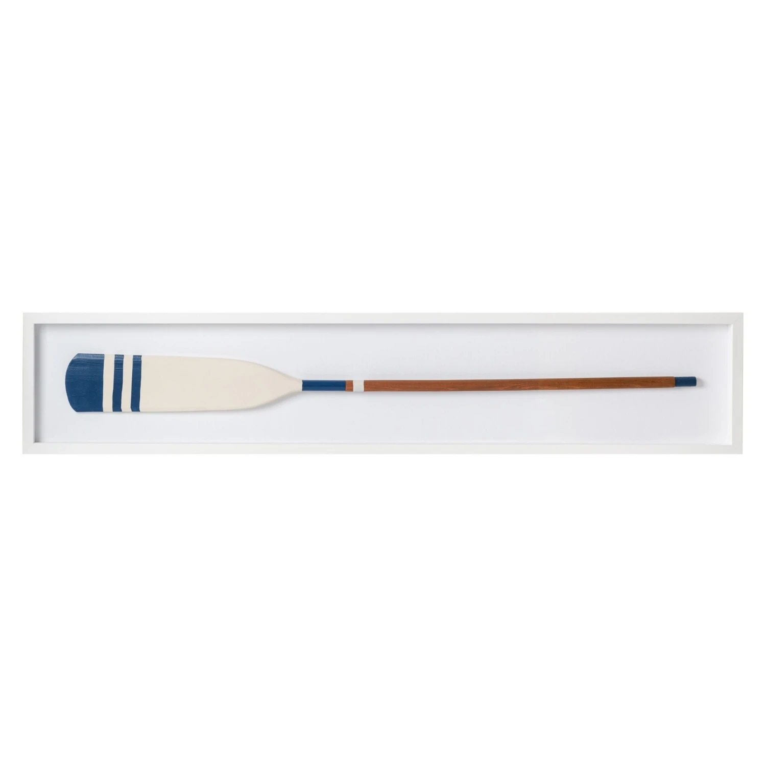This nautical framed art features an authentic, hand-painted oar brimming with character. The blue tones create a stunning contrast with the natural wood grain, and the rustic style tells a tale of seafaring adventures. The oar is artfully mounted on delicate white linen and set in a shadow box with a custom white wood frame.