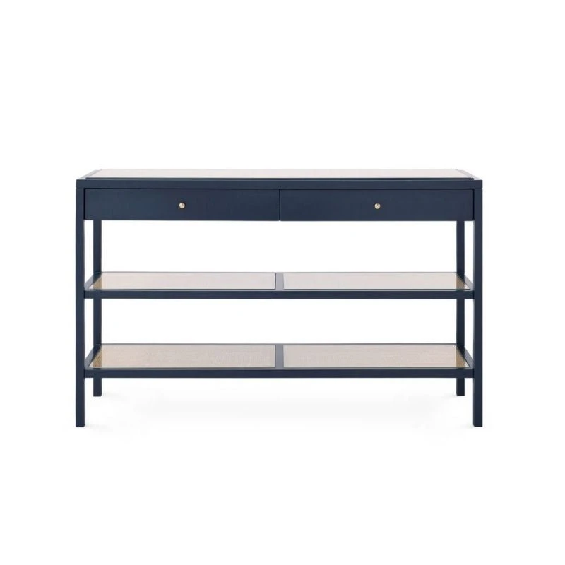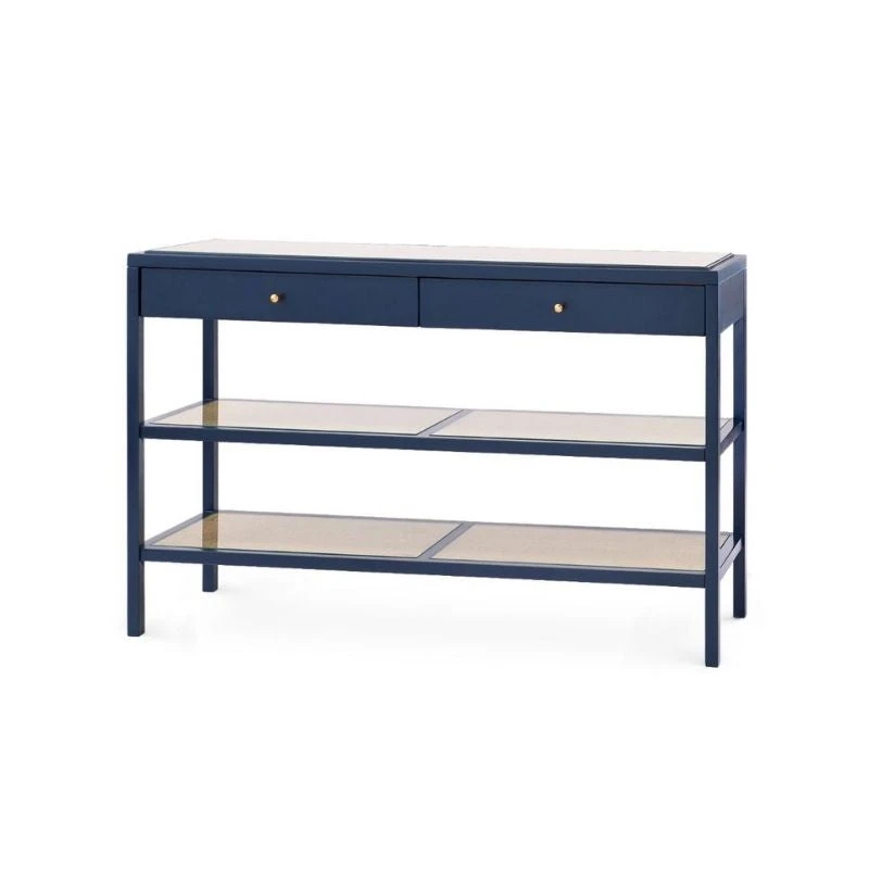 When your space calls for something straightforward and functional, but you don’t want to sacrifice style, look no further than our New Haven Collection. Made by combining lacquered wood with the relaxed touch of bleached cane, the collection is light, airy, and endlessly adaptable. Each of its three shelves is made of woven cane, and is topped with a durable piece of glass. The two top drawers boast polished brass pulls for extra flair. It’s perfect for stacking books, storing necessities, or showing off decorative statues.