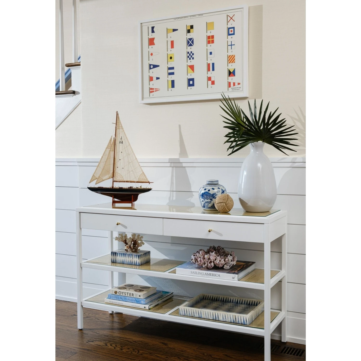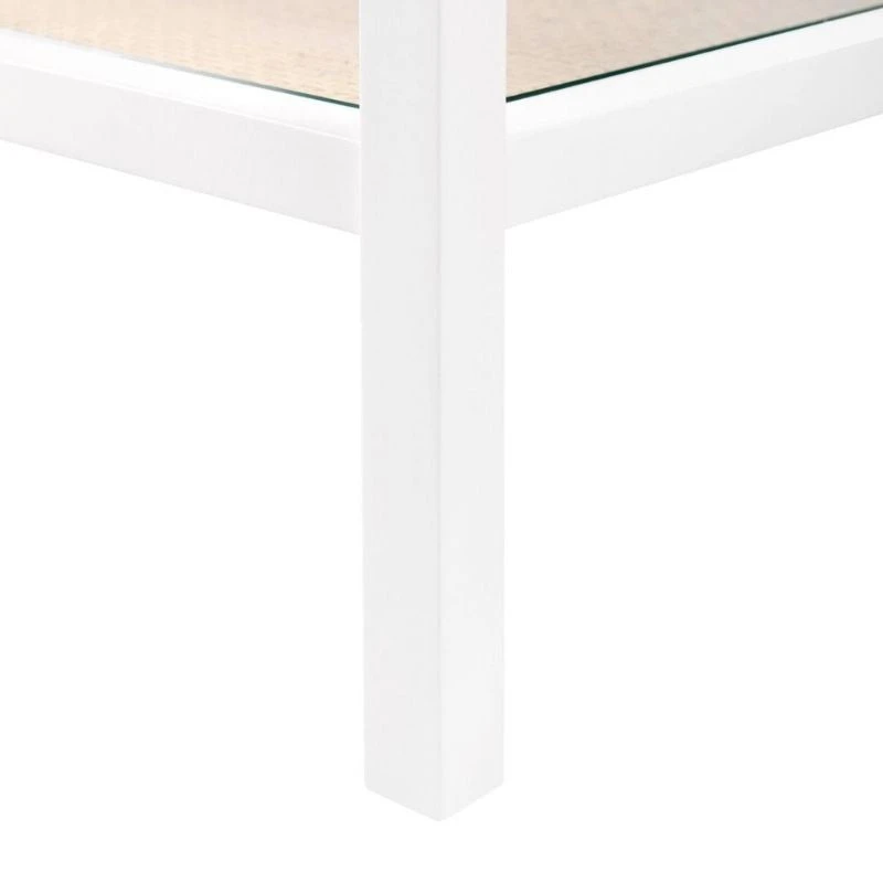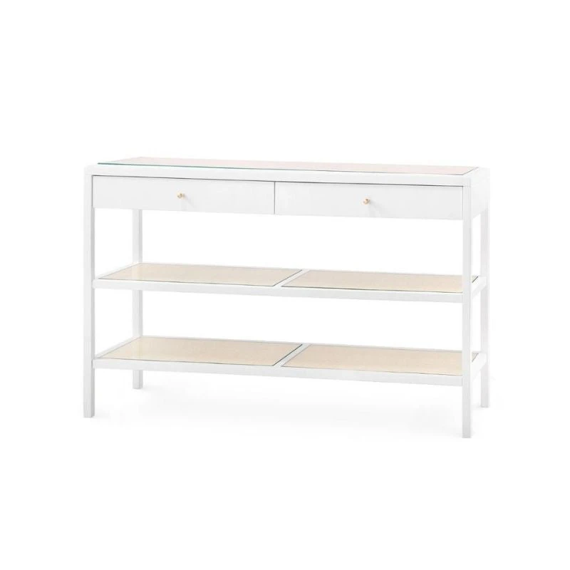 When your space calls for something straightforward and functional, but you don’t want to sacrifice style, look no further than our New Haven Collection. Made by combining lacquered wood with the relaxed touch of bleached cane, the collection is light, airy, and endlessly adaptable. Each of its three shelves is made of woven cane, and is topped with a durable piece of glass. The two top drawers boast polished brass pulls for extra flair. It’s perfect for stacking books, storing necessities, or showing off decorative statues.