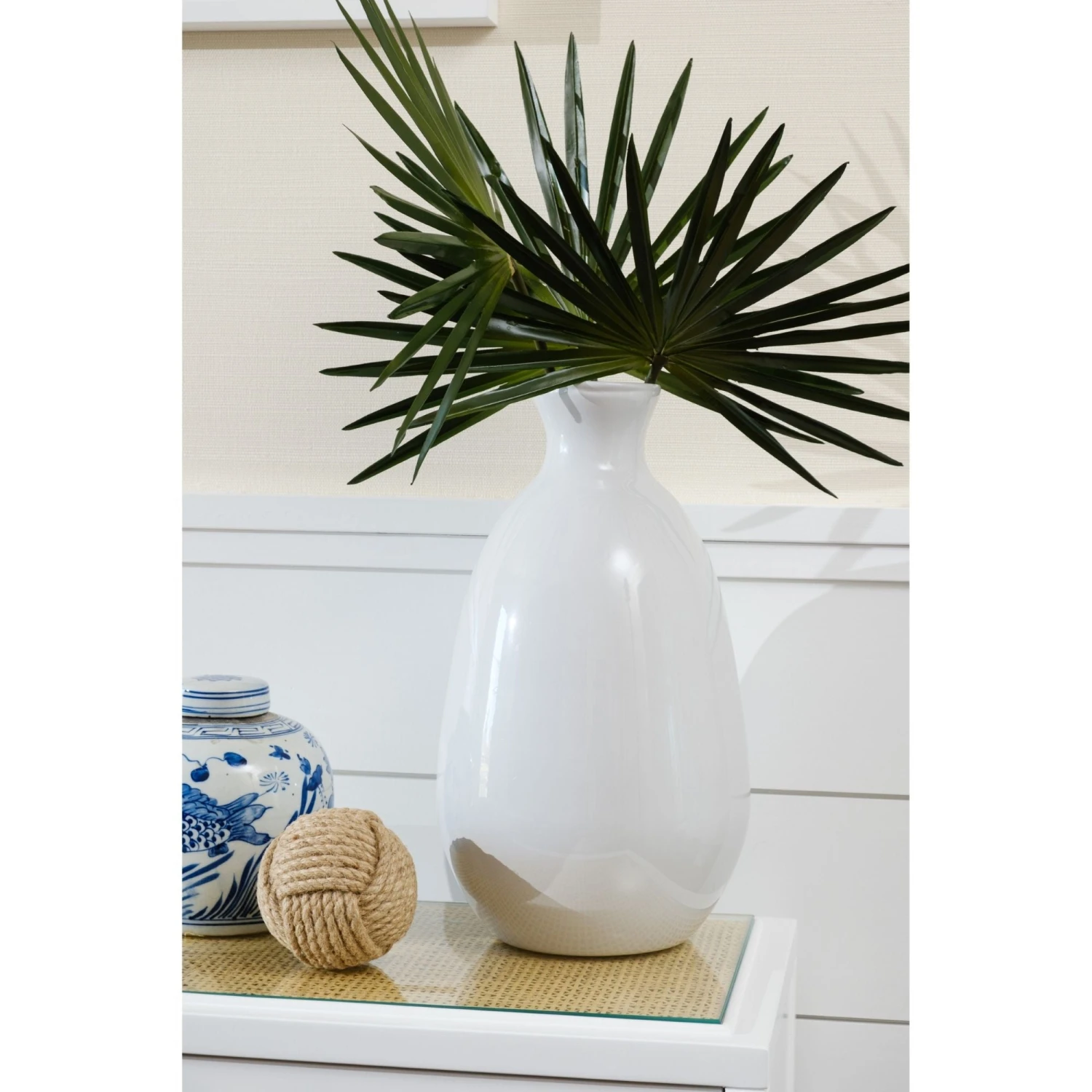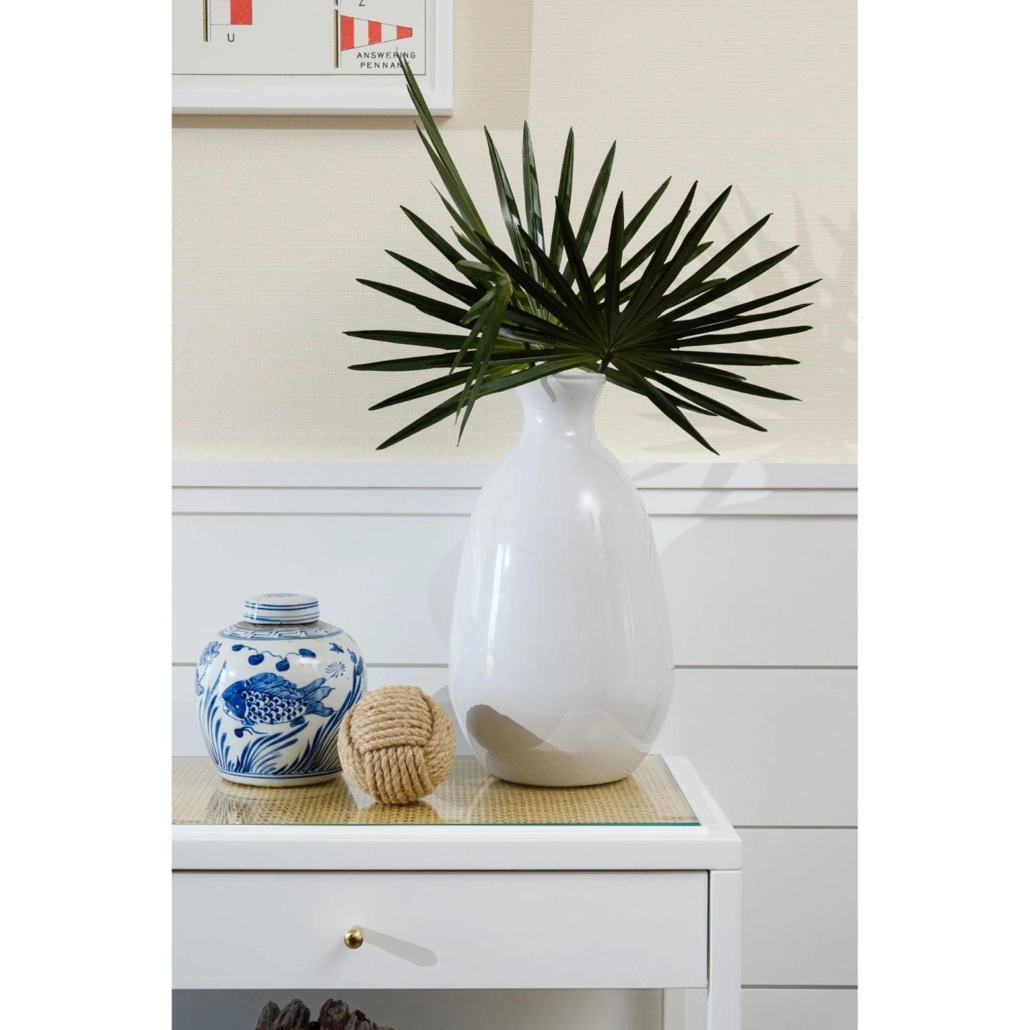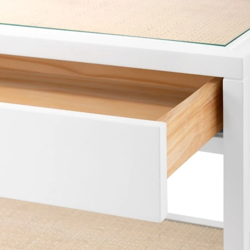 - Made of lacquered wood with bleached cane and clear glass inset.