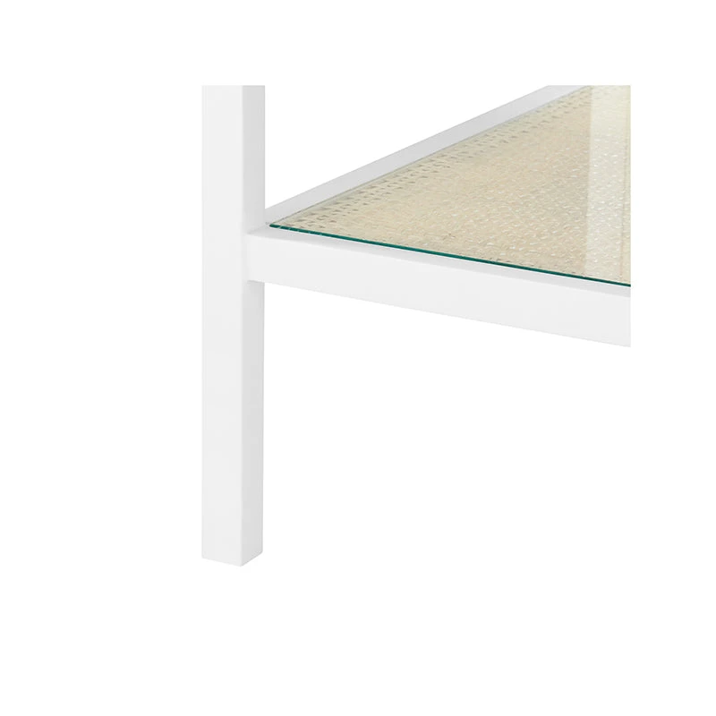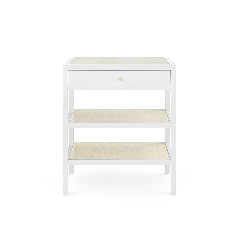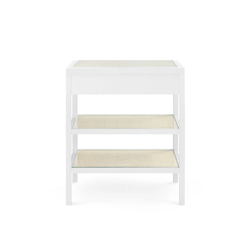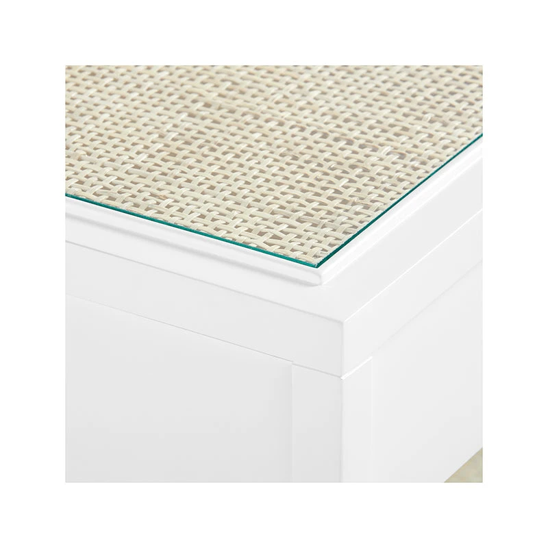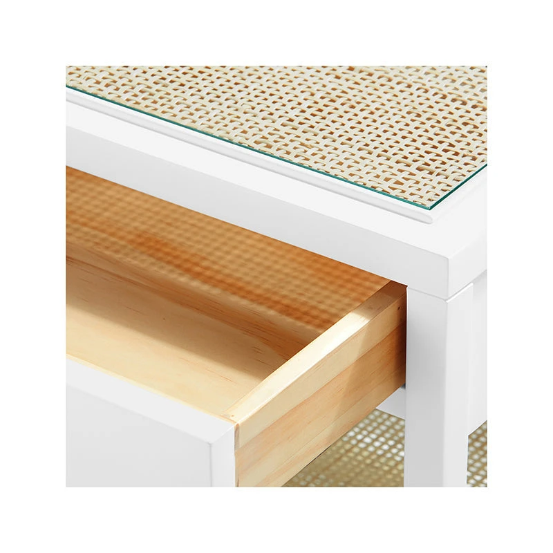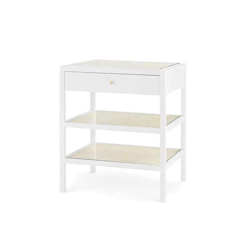 Light and airy, with a sense of openness built right into its form, our New Haven Side Table’s use of rich mixed materials is on full display, as our artisans have combined bold lacquered wood with the relaxed touch of bleached cane shelving. Each surface is topped with a durable layer of glass to ensure lasting use, as the single floating drawer boasts a polished brass pull for extra flair. This versatile side tables works as an occasional table or a nightstand.