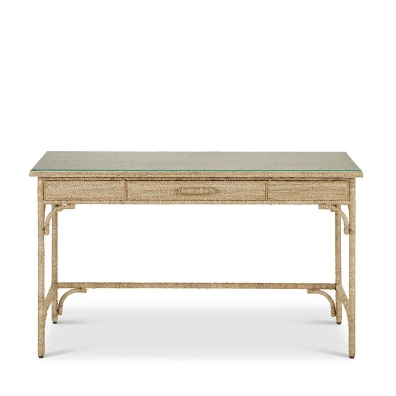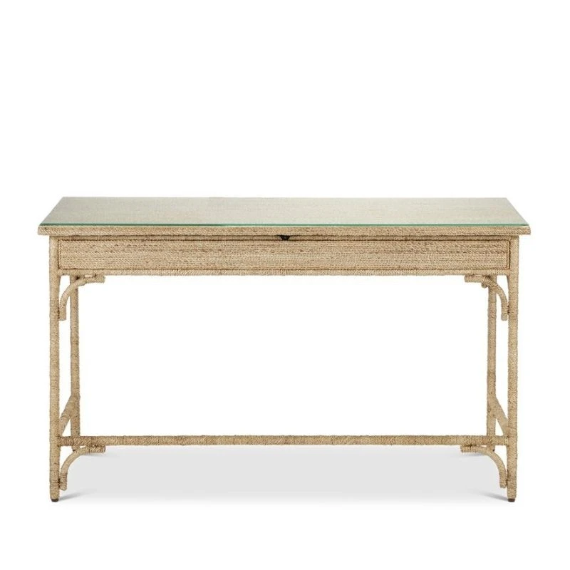 Bring a faraway feel home with our Olisa Desk crafted from iron and wrapped in braided Abacá rope. The natural elegance of this desk makes it well suited for a home office or a business-formal office in which style matters. The desk comes with a glass top that fits into the outer rim of the top and one sleek drawer perfect for storage.