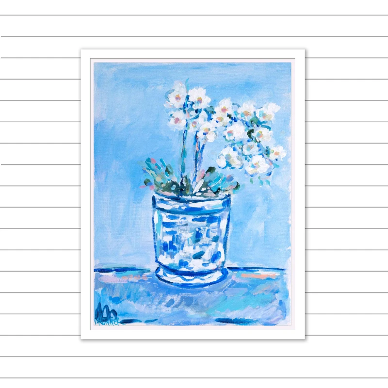Orchid Tide III is a one-of-a-kind original piece of art featuring white orchids arranged in a blue-and-white chinoiserie cachepot against a soft blue background, and perfect for adding a touch of elegance and tranquility to your home. Painted on gallery wrapped canvas, this piece comes in a custom made white wood floater frame.