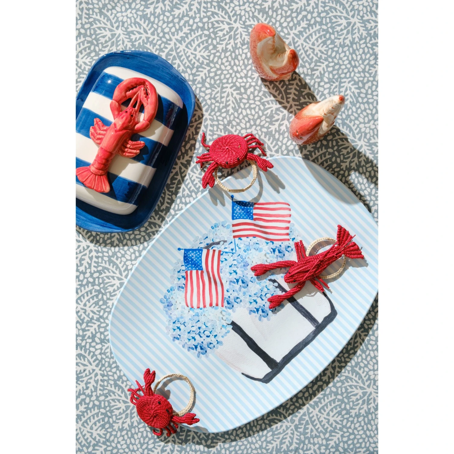 A festive nod to summer’s most celebratory moments. Featuring a classic blue-and-white stripe backdrop and a charming hydrangea tote adorned with American flags, this platter is perfect for Memorial Day, the Fourth of July, and beyond. Made in the USA from an elevated, dishwasher- and oven-safe alternative to melamine that’s BPA- and formaldehyde-free and FDA approved for food – it blends style with effortless function.