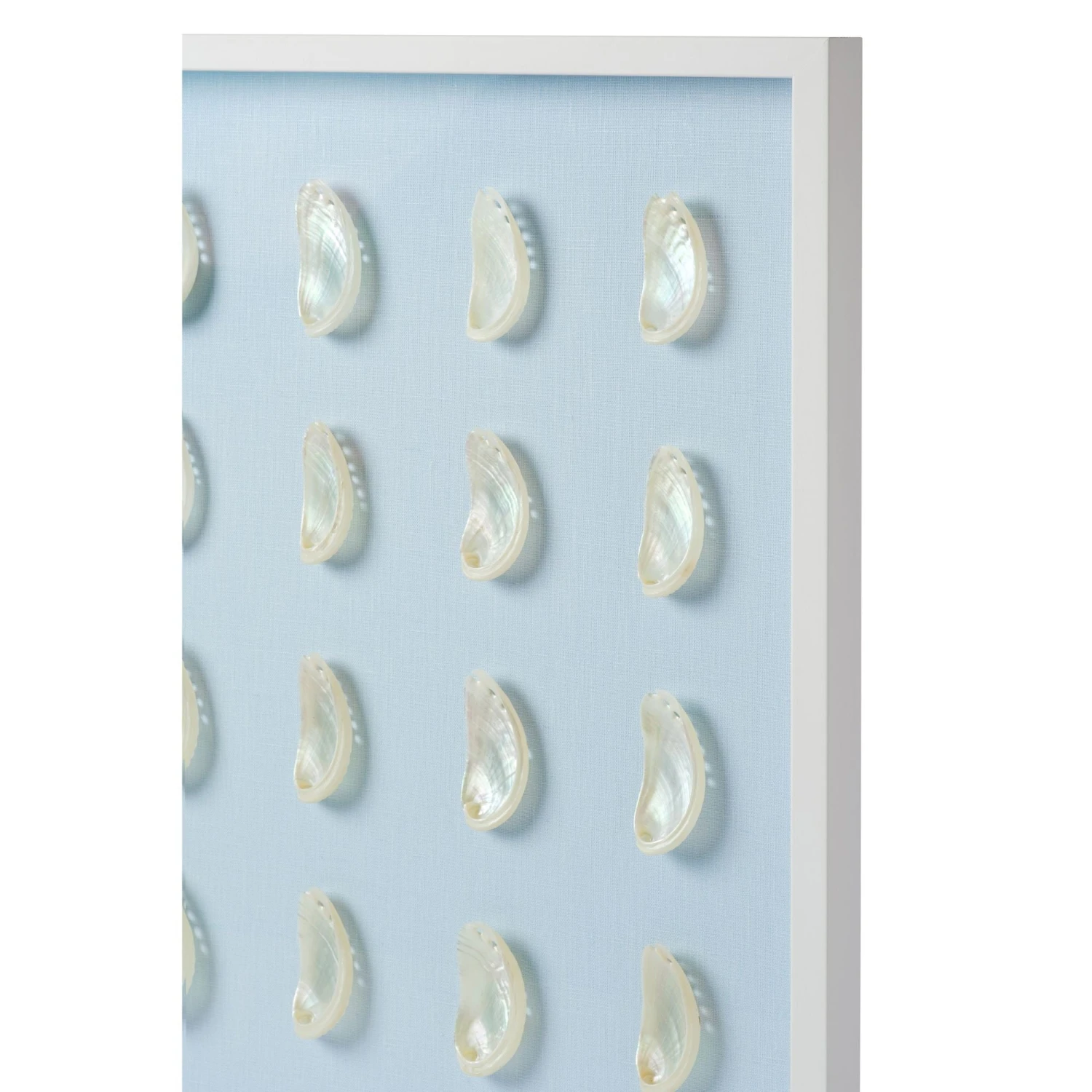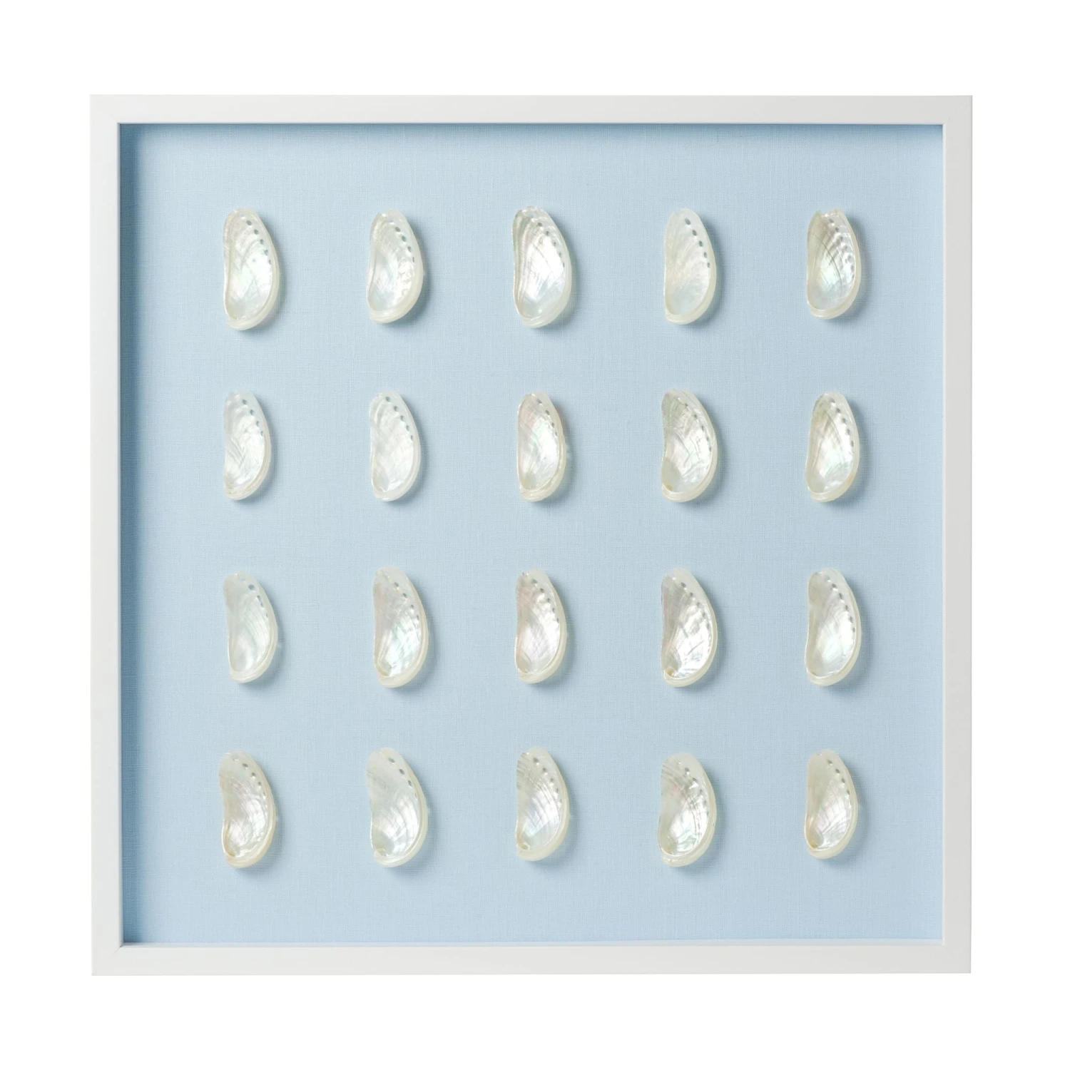 From the depths of the ocean to your walls, capture the beauty of the sea with our nautical collection of natural shell art. Featuring 20 – 30 natural pearl abalone shells affixed to delicate light blue linen in a grid pattern.