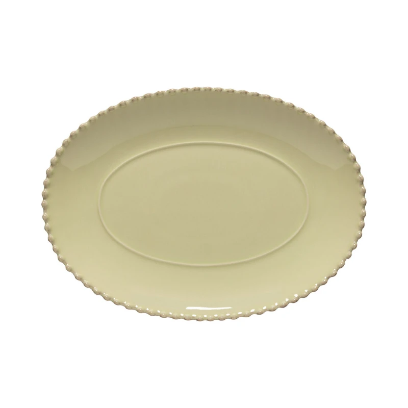 A new take on a customer favorite. This soft lily green colorway offers a fresh update to our best-selling Pearl Collection. Crafted in Portugal from fine stoneware, the Pearl Oval Platter features the collection’s signature beaded edge and a glossy finish. Simple, timeless, and perfect for everything from casual gatherings to everyday meals.