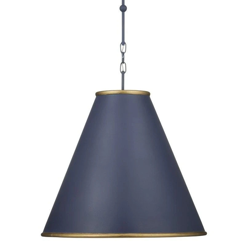 Our popular Pierrepont Pendant is now available in a striking blue! Made of wrought iron with a Dark Blue finish on its exterior and a contemporary gold leaf finish on the interiors of the shades. Offering a modern nautical look, these pendants are available in a small and large size. The rings connecting them gleam in a painted gold finish.