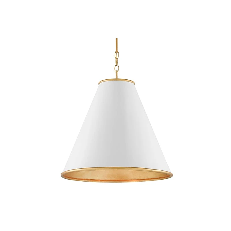 Our Pierrepont White Pendant is made of wrought iron with a gesso white finish on its exterior and a contemporary gold leaf finish on the interiors of the shades. Available in a small and large size. The rings connecting them gleam in a painted gold finish.