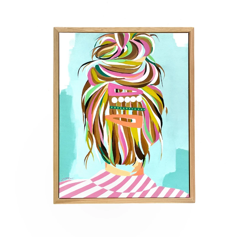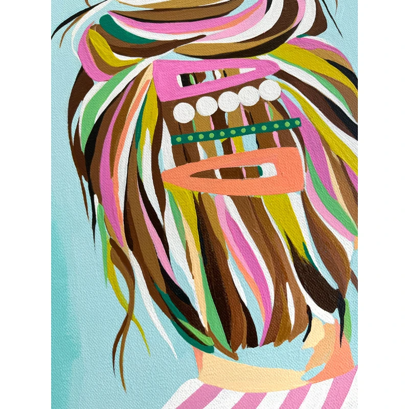 Part of the Hair Study series, Rainbow Sprinkles is an original painting by artist Jaime McCarrier. This piece features a girl with a classic top knot bun in rainbow colors accented by a pink striped collared top.