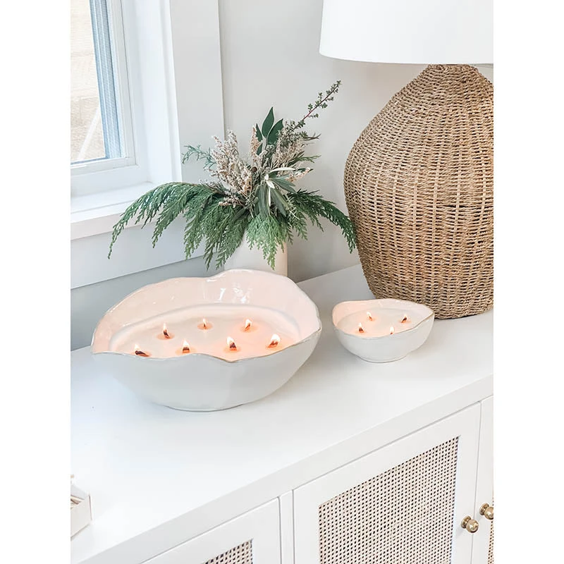 Our stunning Cailíní Coastal 4-Wick Candle Bowl is certain to infuse your home with a refreshing and calming coastal aroma! Featuring a beautiful hand-crafted porcelain glazed ceramic bowl vessel that can be reused long after the candle is gone. Enjoy the soft glow from this stunning decorative accent, ideal as a centerpiece.