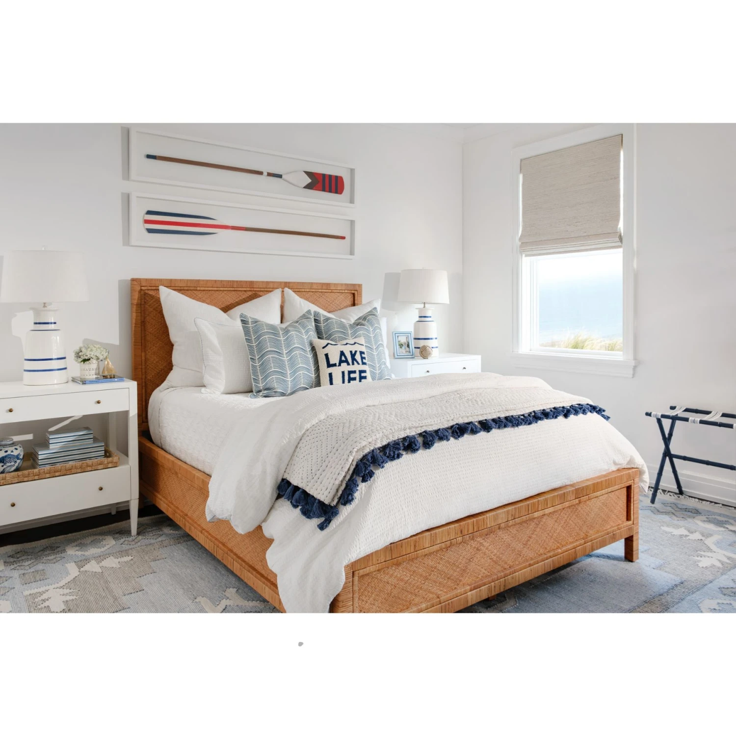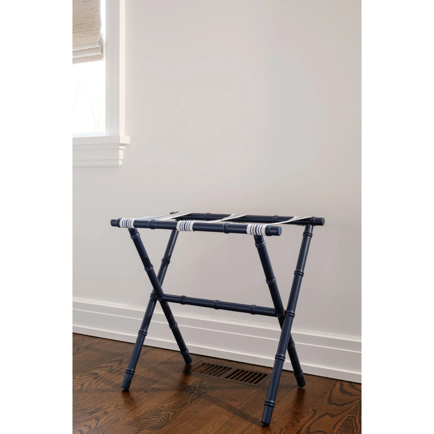 Handcrafted in the USA from maple wood with a navy finish, this piece exudes coastal charm, complemented by heavyweight navy and white striped straps for a touch of nautical flair. Plus, its convenient foldable design ensures effortless storage when not in use, making it both stylish and practical.