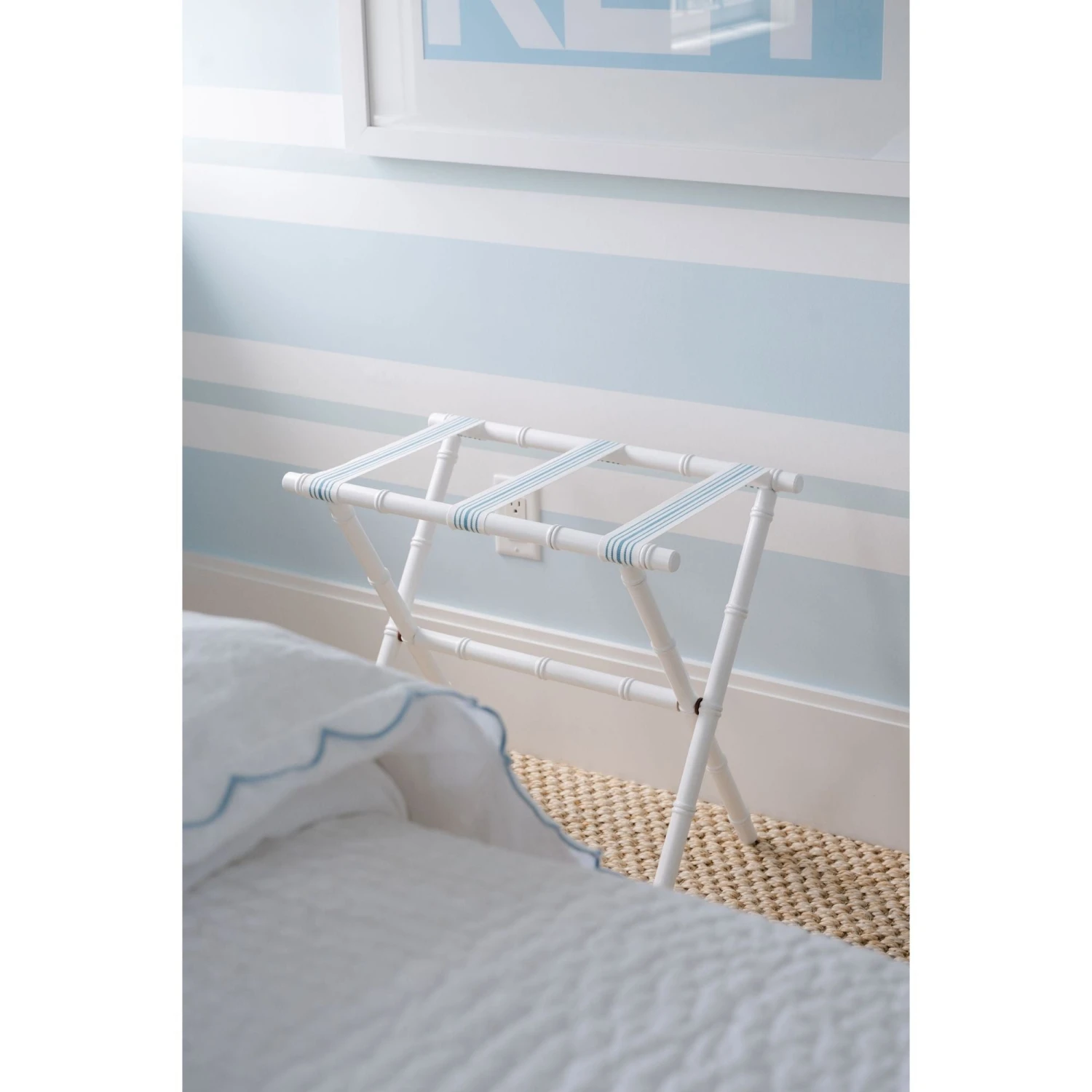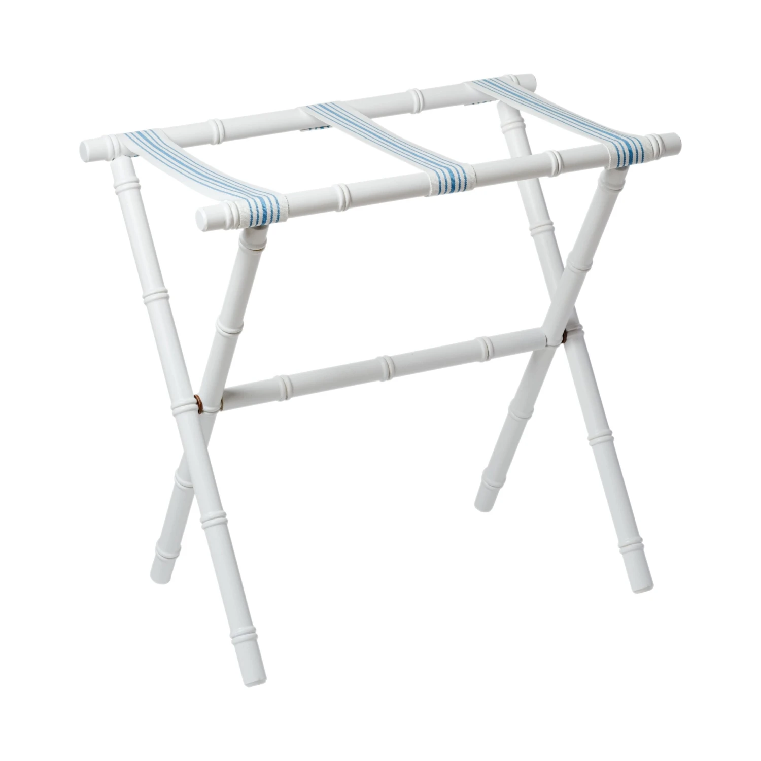 Handcrafted in the USA from maple wood with a white faux bamboo finish, this piece exudes coastal charm, complemented by heavyweight light blue and white stripe straps for a touch of nautical flair. Plus, its convenient foldable design ensures effortless storage when not in use, making it both stylish and practical.