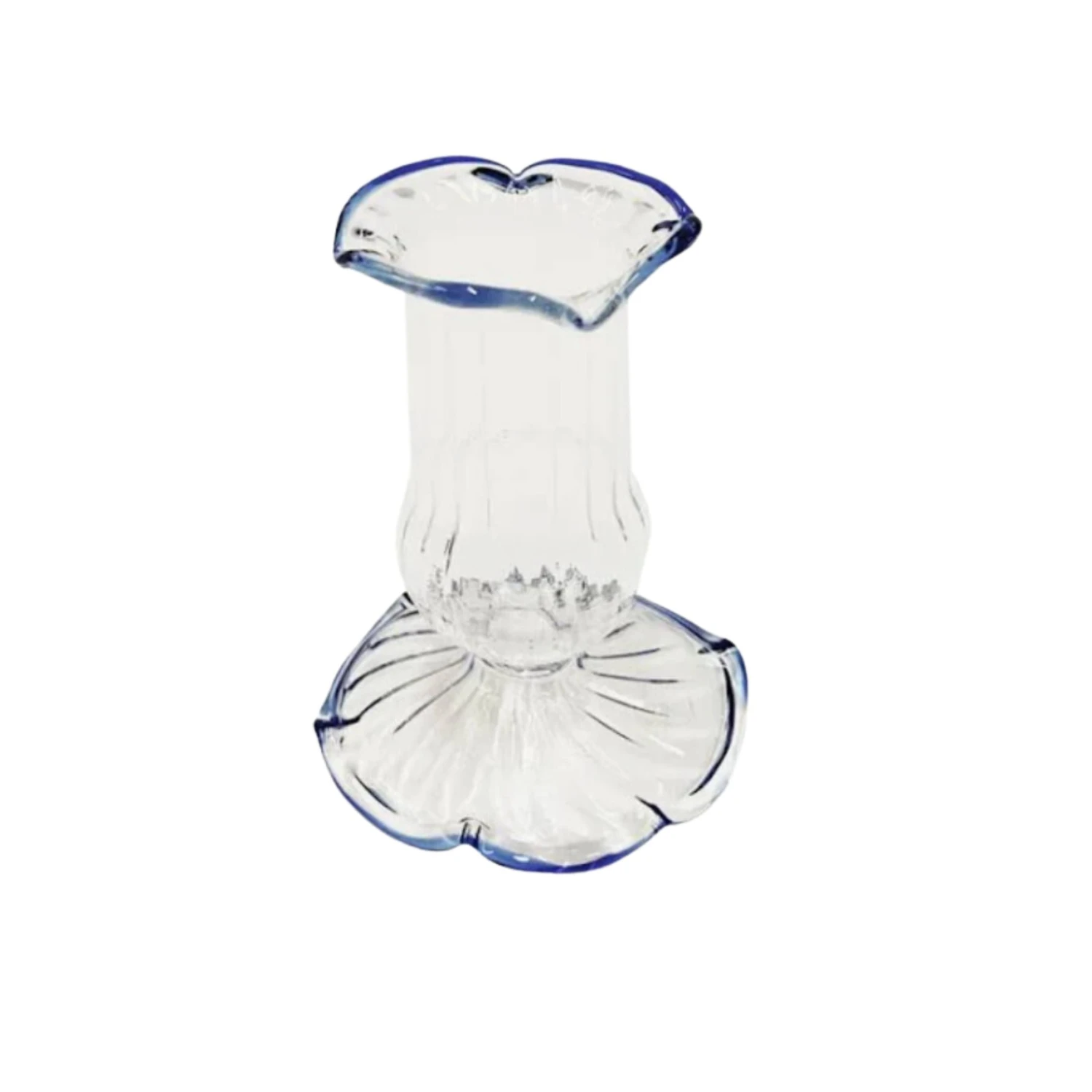 Handcrafted from mouth-blown glass, this taper features subtle blue detailing at the rim and base for a soft, understated touch. Each piece comes with a clear glass cylinder that transforms the taper holder into an elegant hurricane. Perfect for adding romance and warmth to any tablescape or mantel, offering timeless beauty in both everyday moments and special occasions.