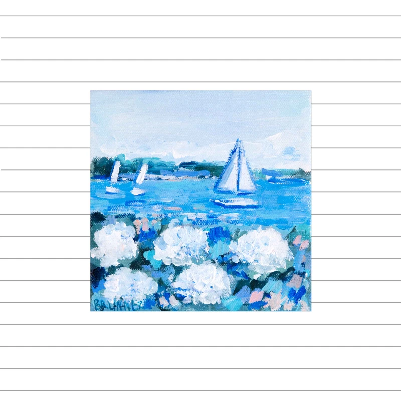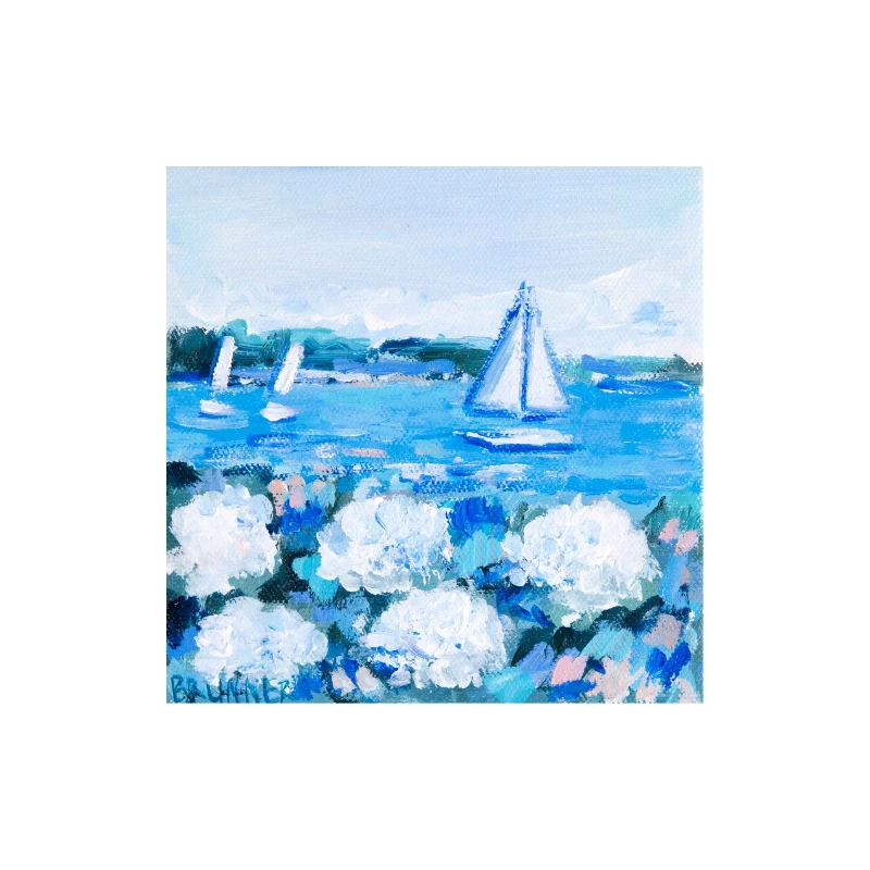 Mini Sails and White Blooms II is part of our beloved Mini Series: a collection of original 6″ x 6″ paintings by Ohio-based artist Michelle Brunner. This one-of-a-kind piece captures white hydrangeas in bloom with sailboats gliding in the distance, beautifully rendered in soft, impressionistic brushstrokes.