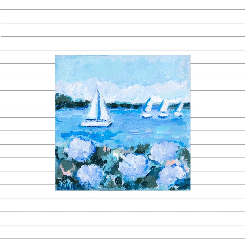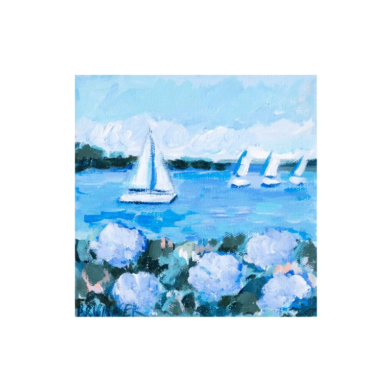Mini Sails and White Blooms III is part of our beloved Mini Series: a collection of original 6″ x 6″ paintings by Ohio-based artist Michelle Brunner. This one-of-a-kind piece captures white hydrangeas in bloom with sailboats gliding in the distance, beautifully rendered in soft, impressionistic brushstrokes.