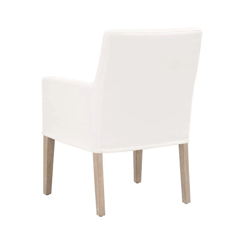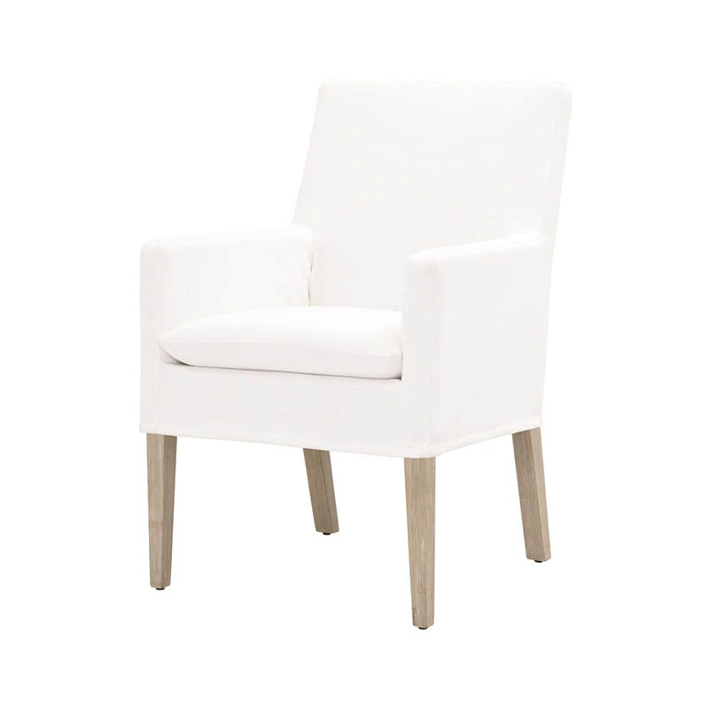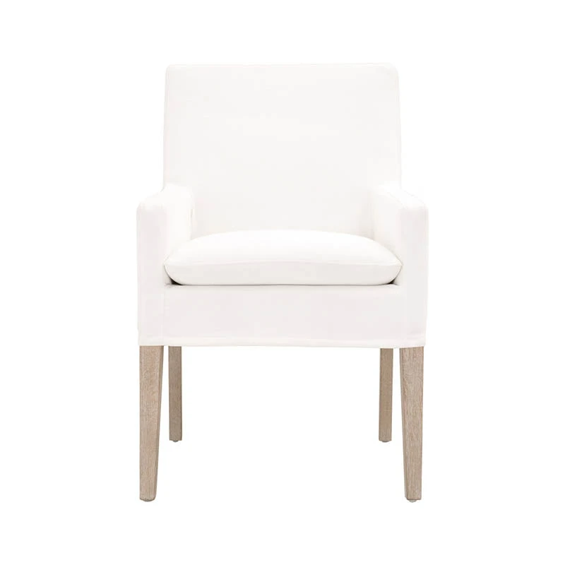 Anything but basic, our understated yet elegant Saint Malo Slipcover Arm Chair is guaranteed to add sophisticated style to any dining space. It’s strong enough for daily wear and tear thanks to a solid oak base and LiveSmart performance fabric yet chic enough for formal living. The plush cushioned perch is one you’ll never want to leave. Constructed from natural materials, this piece may have minor variations in color, texture, and beauty marks, which enhances its natural charm.Â