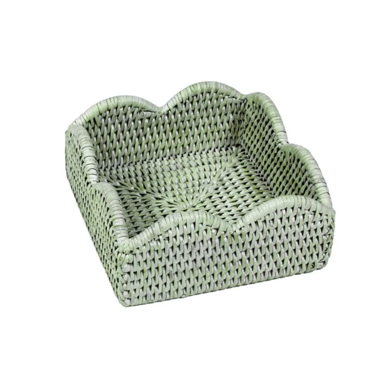Our handwoven Scallop Rattan Cocktail Napkin Holder is expertly crafted from durable rattan and finished in a stunning lacquered green hue. This charming piece is not just an essential for entertaining; it’s a statement of style. Perfectly sized to cradle your paper cocktail napkins, it ensures they’re always neatly presented and within reach, whether adorning your dining room, coffee table, or kitchen counter. Elevate your hosting experience with this exquisite accessory, adding a touch of island chic to every gathering.