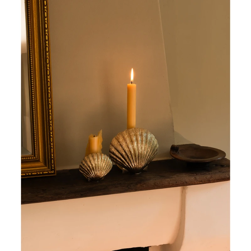 Add a vintage-inspired touch to your home with the Scallop Shell Taper Holder. Handmade in India, each piece is crafted with exquisite attention to detail, featuring a scallop shell design that evokes timeless charm. Perfect for enhancing any dining or mantel display with a hint of nostalgic style.
