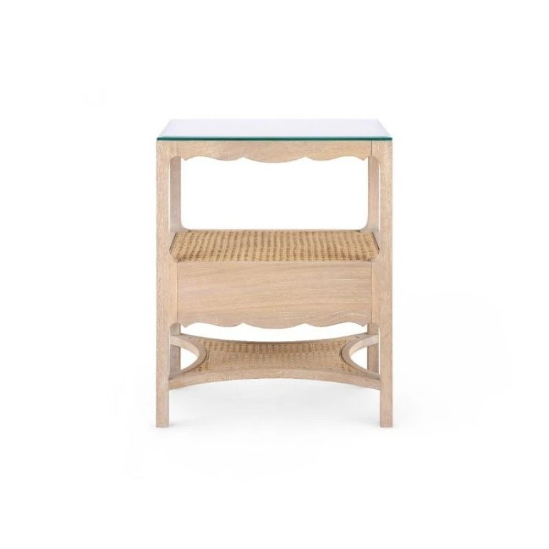 Adorned with delicate hand-carved detailing, our Sea Cliff Side Table offers feminine style.  Made of cerused oak with two shelves of bleached octagonal cane, perfect for stacking books, storing necessities, or showing off decorative objects. The top surface is protected by a layer of clear inset tempered glass, and one drawer with a dainty brass pull.