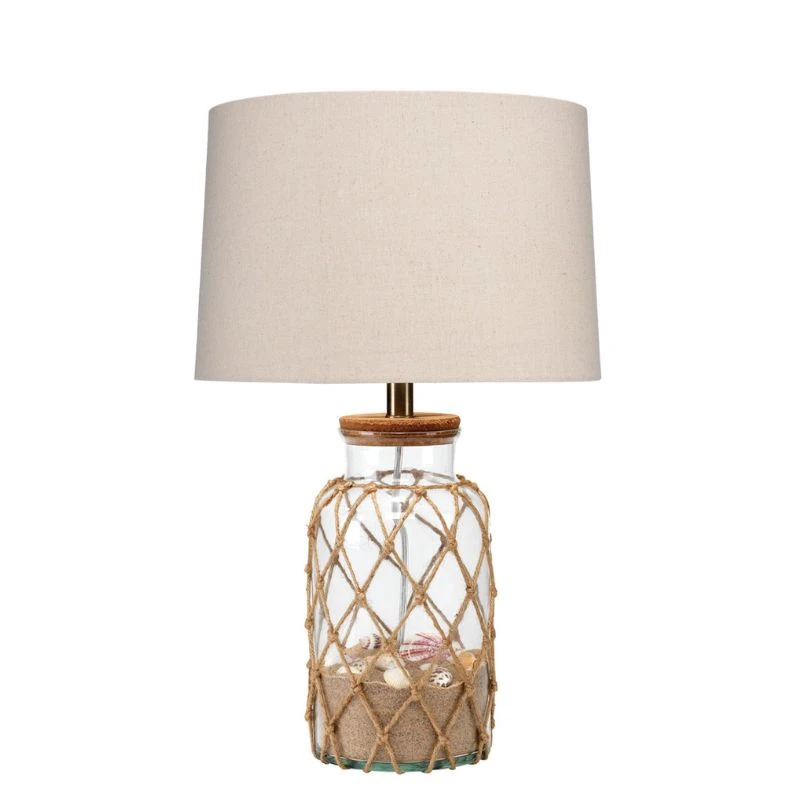 Our Seafarer Table Lamp is the ultimate coastal-chic table lamp perfect for a beach or lake home. A clear glass jar table lamp wrapped in a beachy natural jute net and removable cork top. Fill the base of the lamp with sand and/or shells for extra coastal charm.Â