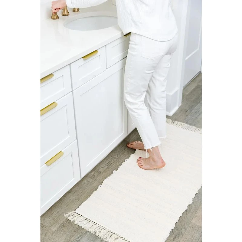 Our Shoreside Bath Mat is certain to give your bathroom an upgrade. Resembling a sophisticated area rug, rather than a bath mat, each piece is intricately hand-woven from 100% cotton, creating clean-lines and a luxuriously soft feeling underfoot. While it’s traditionally used in the bathroom, we love to style these handwoven mats in a laundry room or kitchen as well.