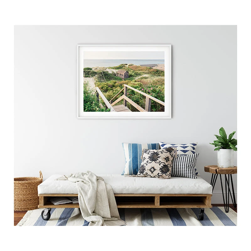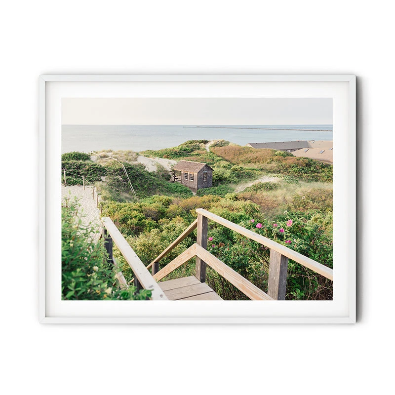 With its sweeping view of the beach, this print of Steps Beach is the perfect choice for creating a coastal aesthetic in the home. The stunning image of this popular destination on the island of Nantucket is beautifully captured by photographer Zofia Crosby. The print features a gorgeous view from the wooden steps, with a wide view of the coastline that includes “The Shack” in summer. Beach roses in bloom peek out from the greenery, adding a vibrant pop to the photograph’s serene color palette.