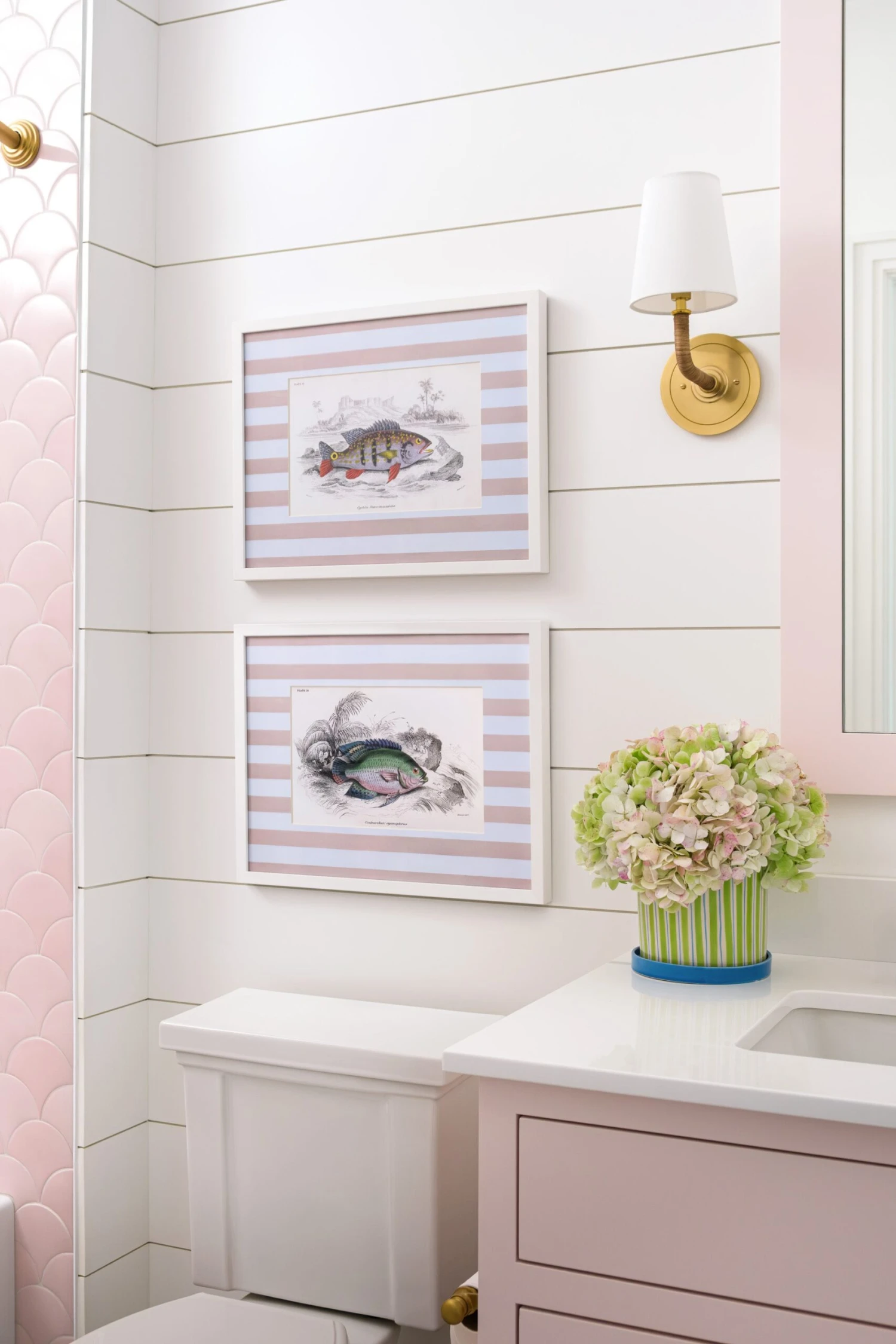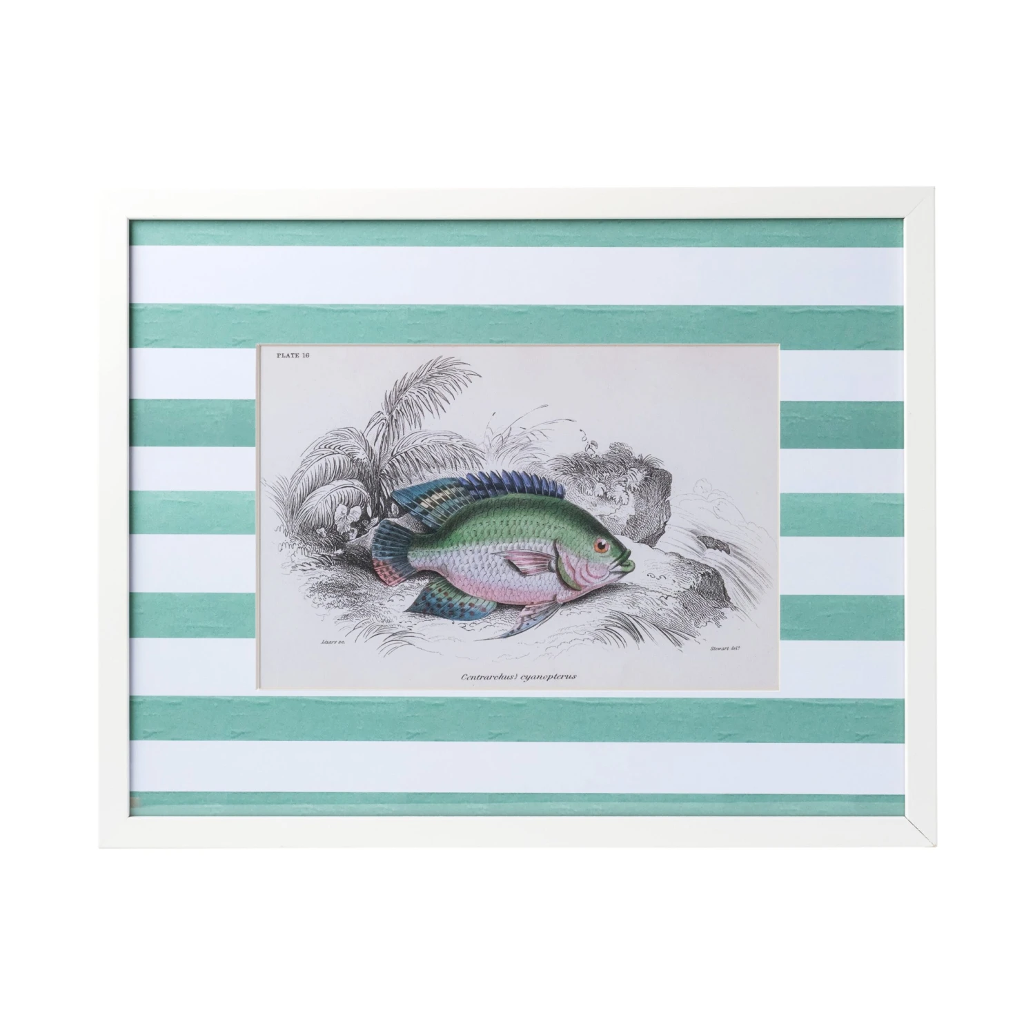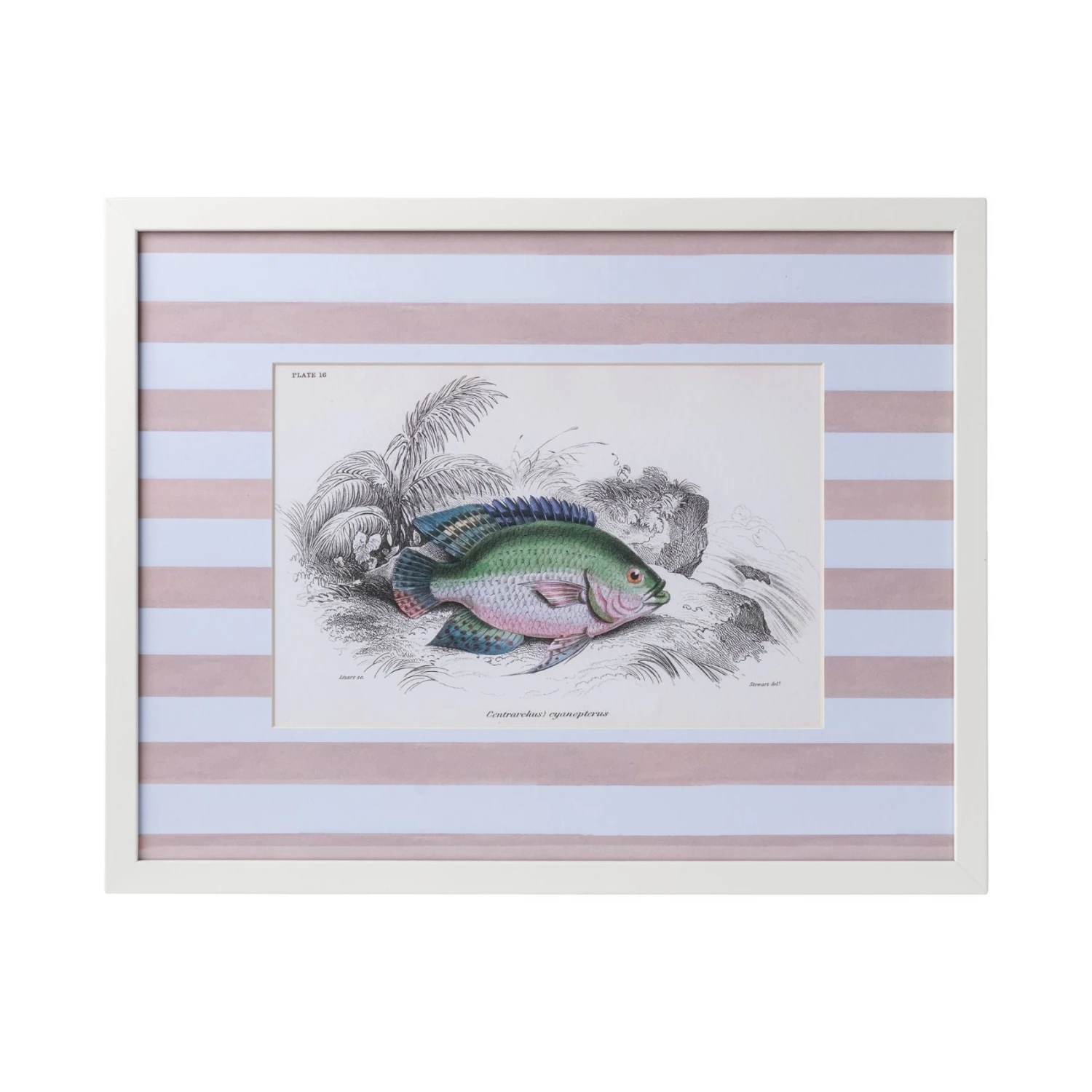 These vintage-inspired fish prints showcase various species, bringing an outdoorsy feel to your space. Each print is accented with a striped mat—available in painterly blue, pink, or green—and finished in a custom white wood frame for a fresh, tailored look.