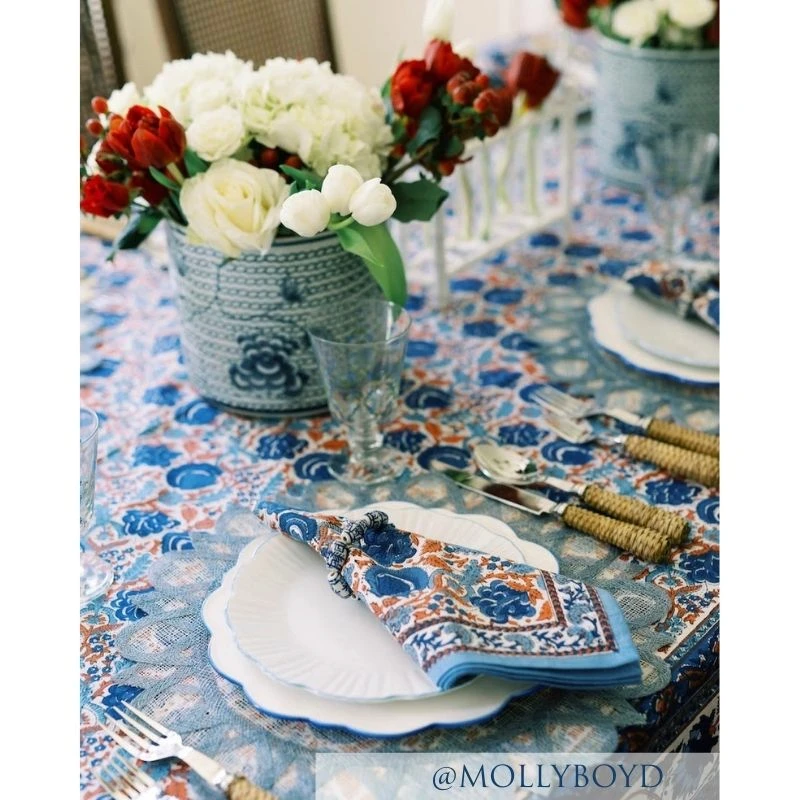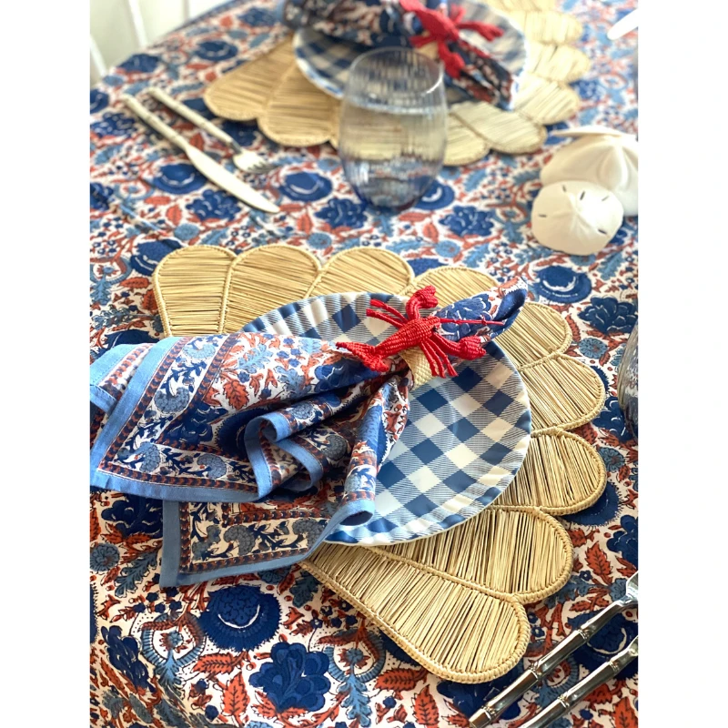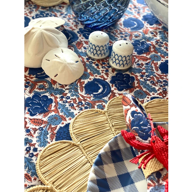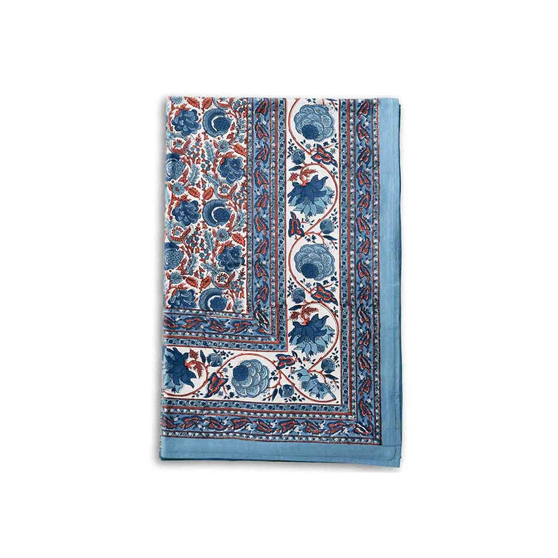 Our beautiful Summer Rose Tablecloth features floral motifs in paprika and shades of blue. Made of 100% cotton, this tablecloth is hand block printed in India and pairs beautifully with our matching Summer Rose Napkins.