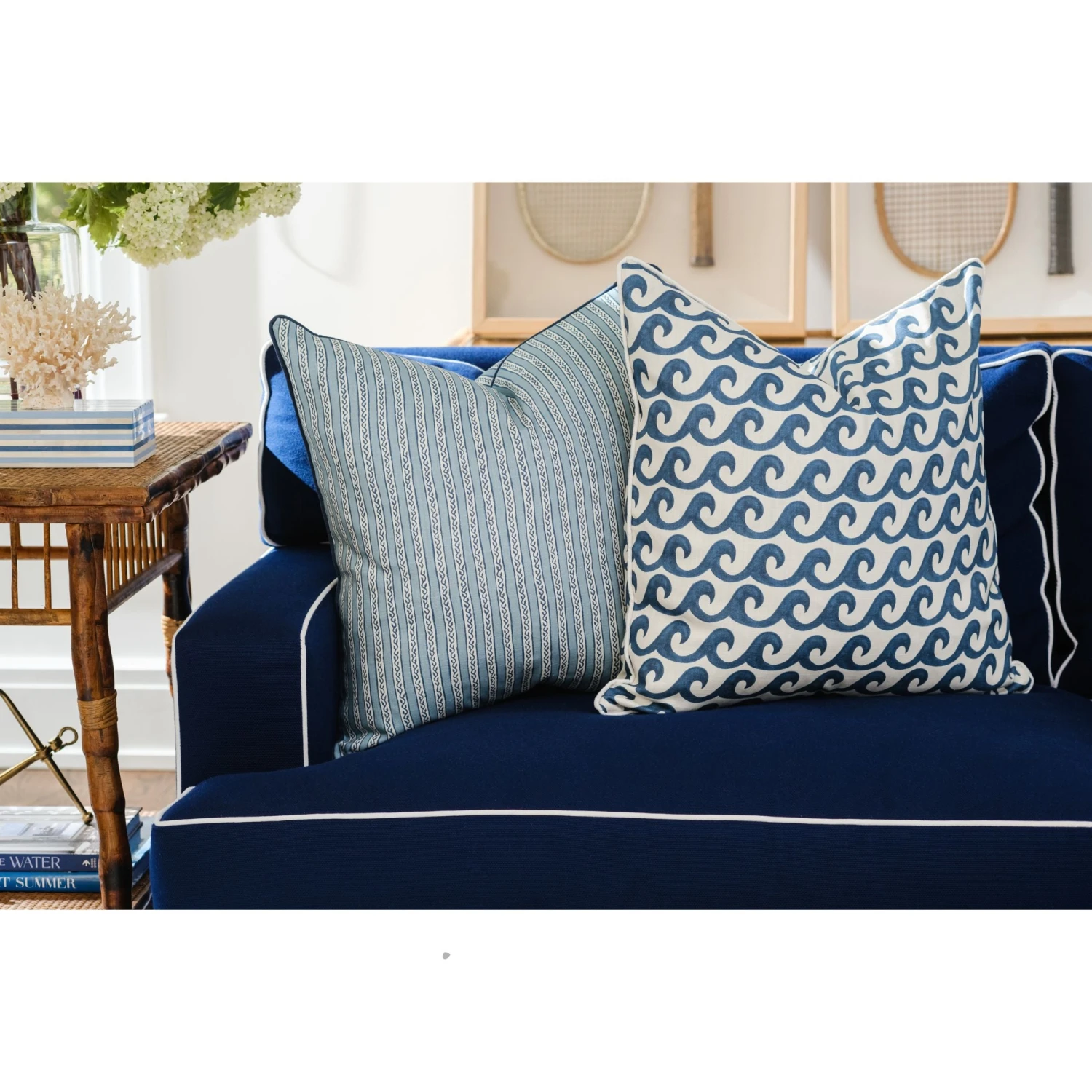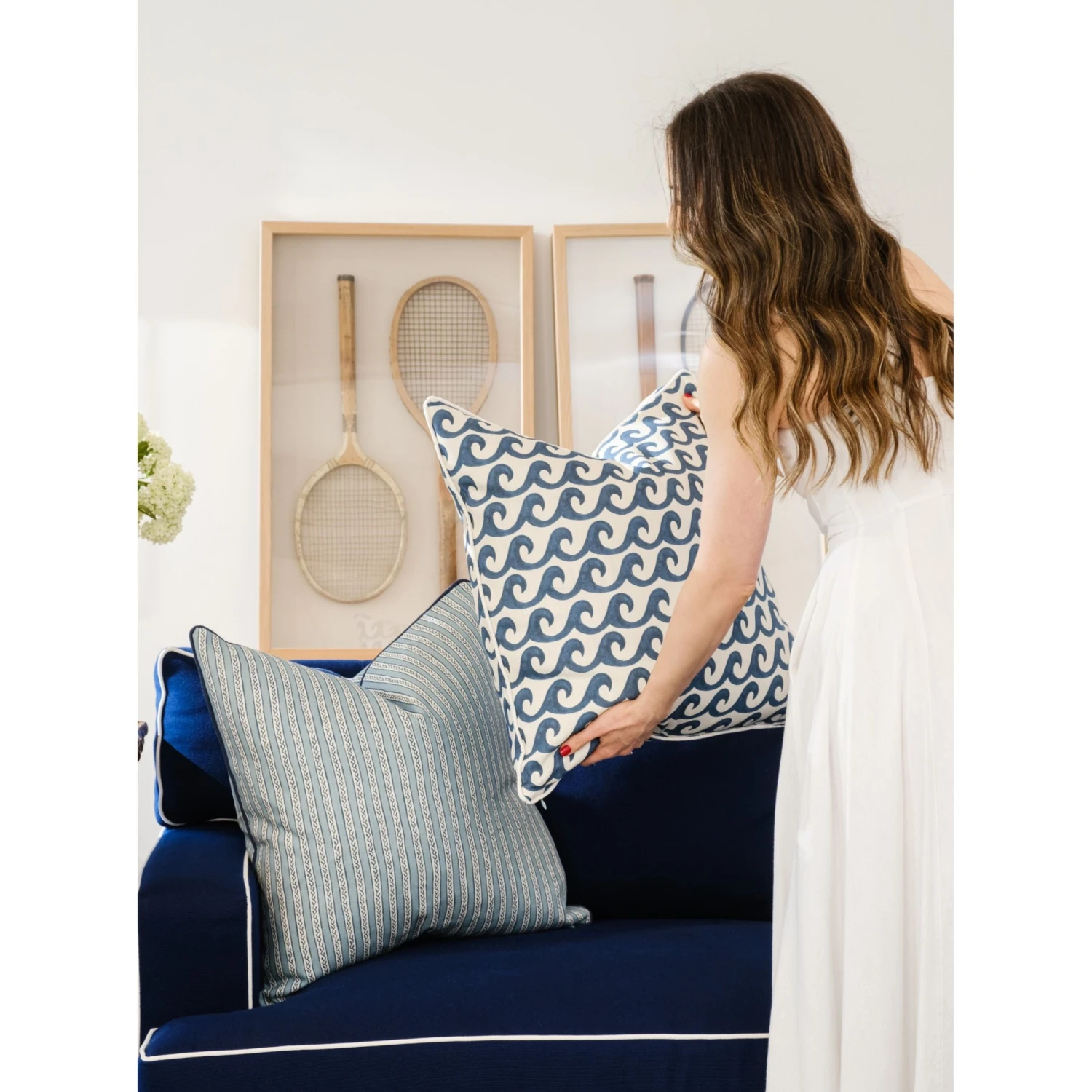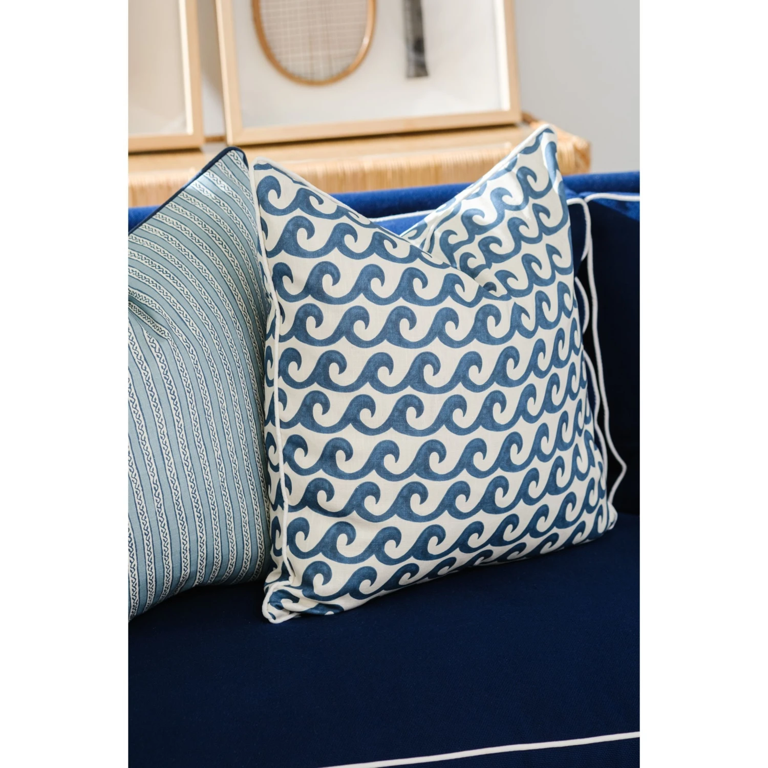 Surfs up! Ride the waves of style with our Swell Pillow. Featuring a dynamic wave-inspired design in a deep blue hue, this pillow brings the laid-back vibe of the surf straight to your home. Accented with piped trim for a clean, polished look, it’s crafted from a soft cotton-linen blend. With the design gracing both the front and back, it’s a versatile piece that complements any coastal space. Perfect for a beach house or a kid’s room, this pillow adds a fun, carefree touch wherever it lands.