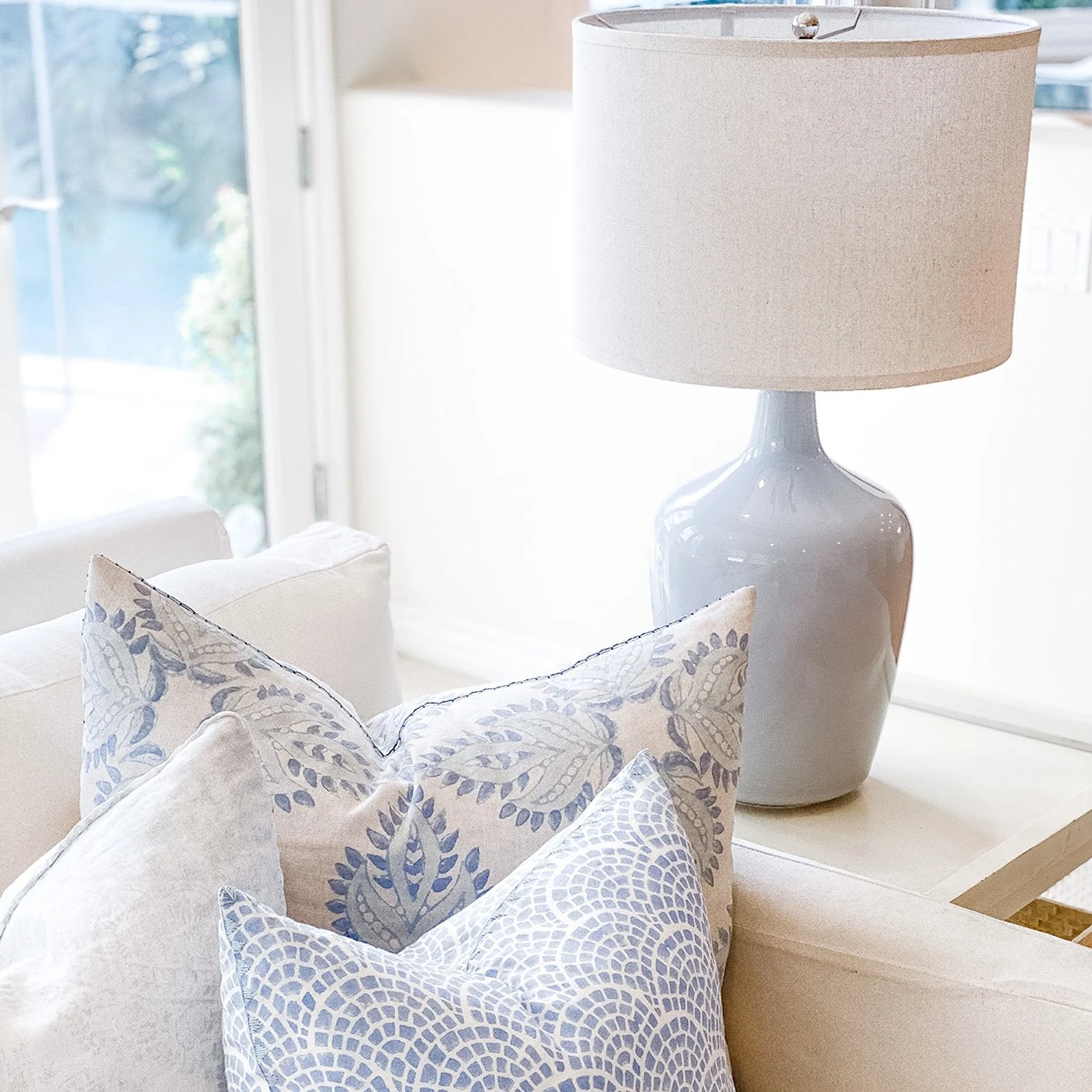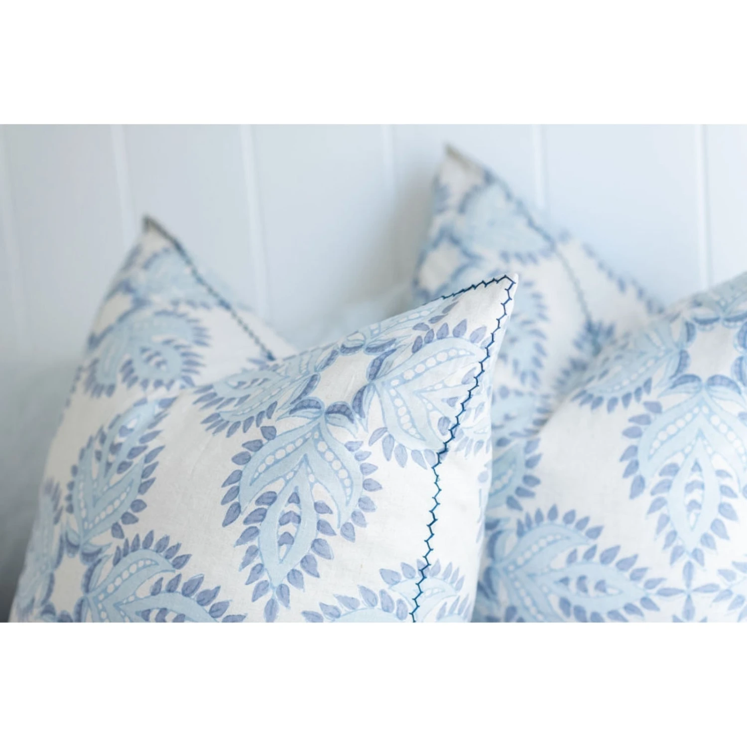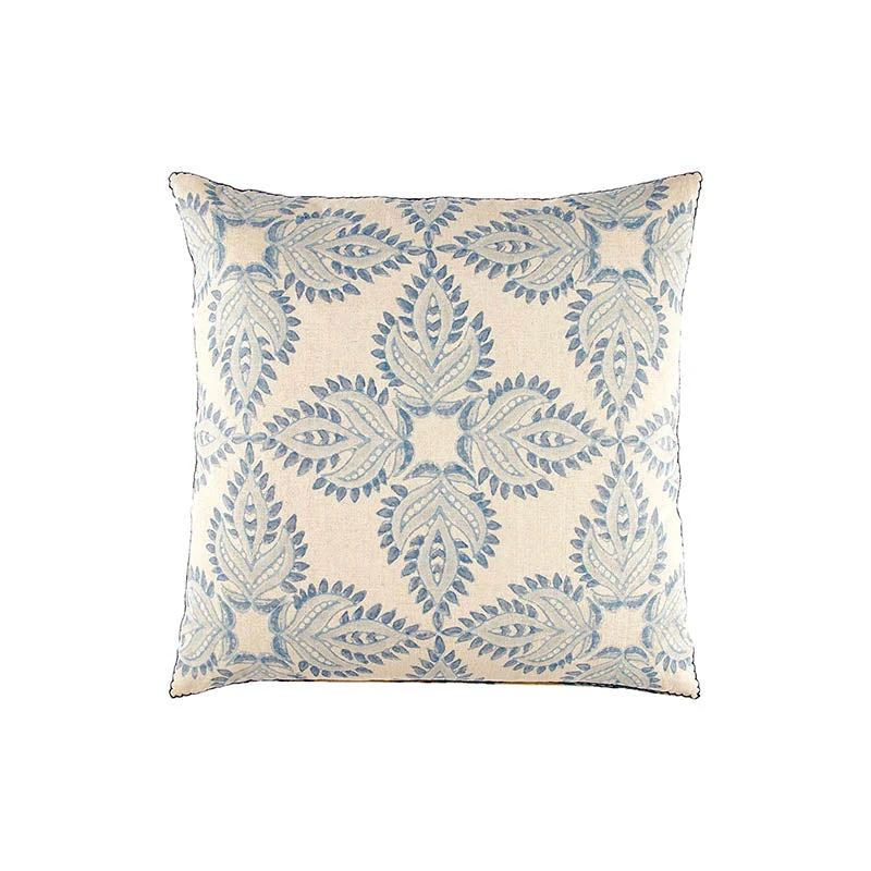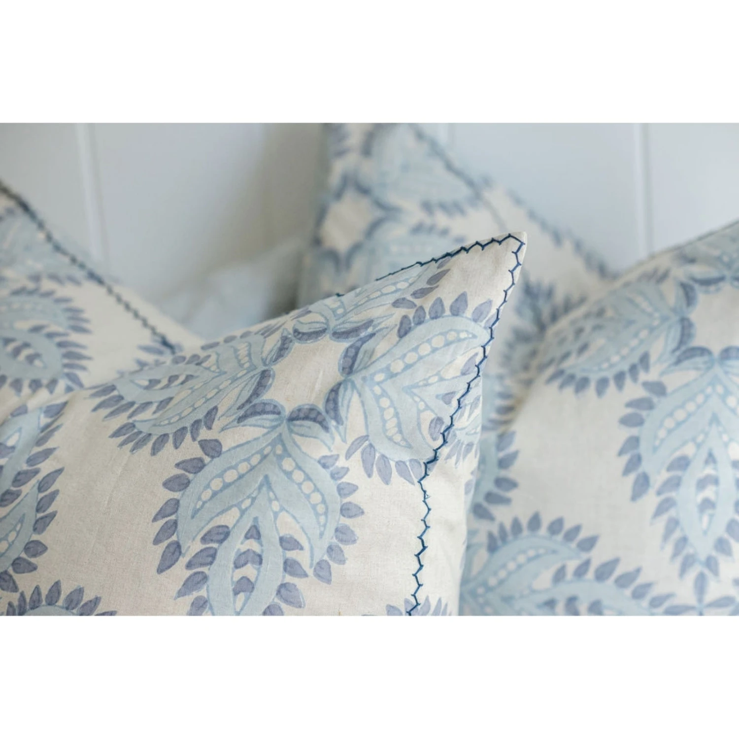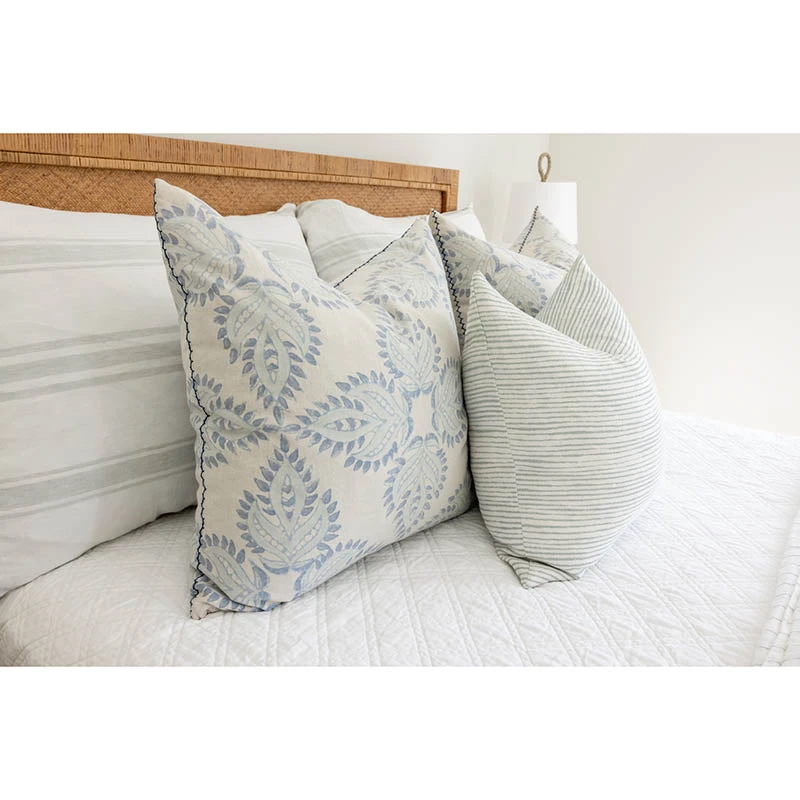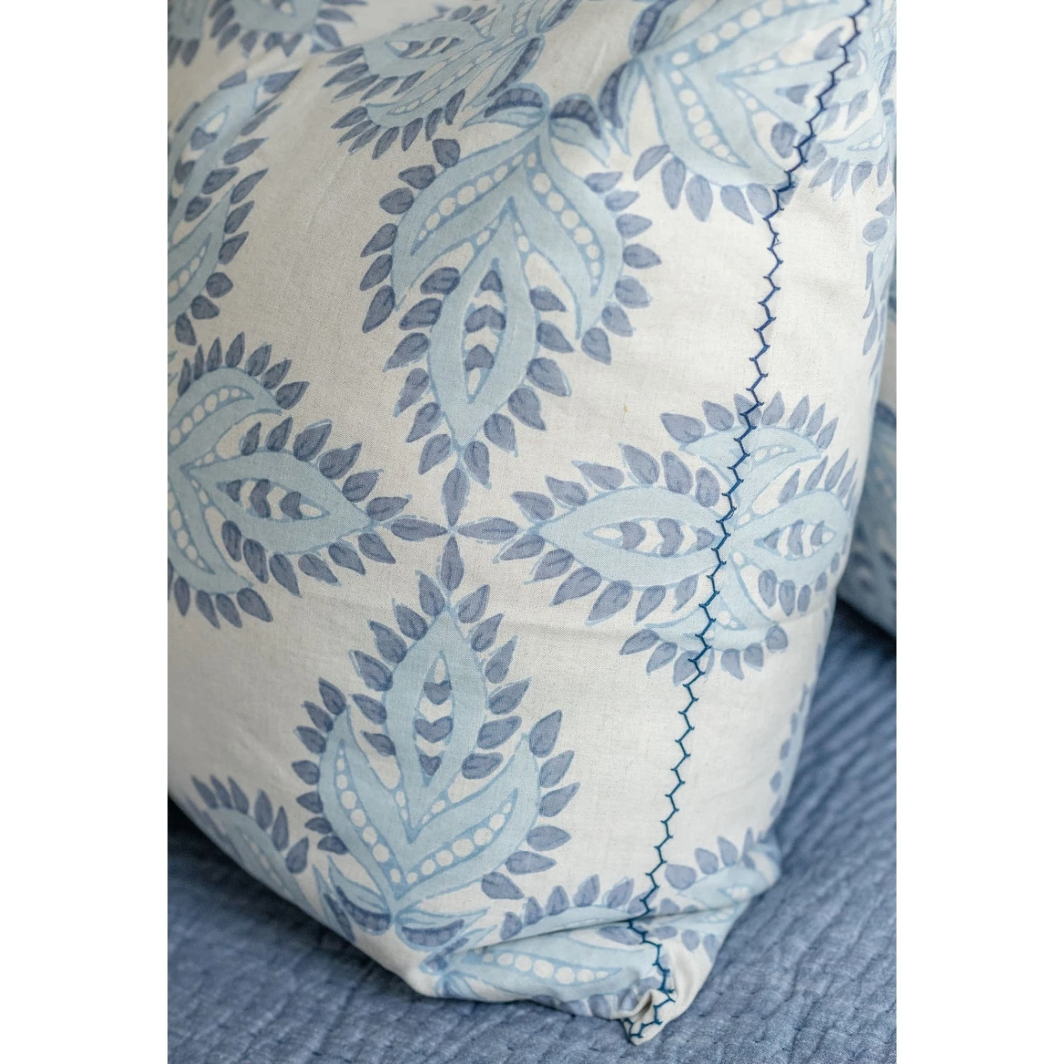Our Verdin Lapis Euro Pillow comes from celebrated textile designer John Robshaw, and features muted blues against cream to achieve a design that is as dreamy as it is soothing. This best-selling design is block printed by hand on super soft cotton linen with hand stitched edging. This euro sized decorative pillow is perfect for dressing up a bed or an oversized sofa, and is designed to be mixed and matched with other patterns to elevate your interior.