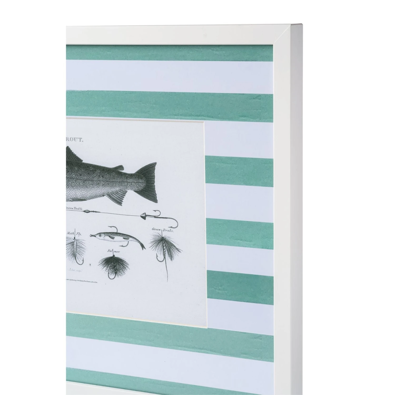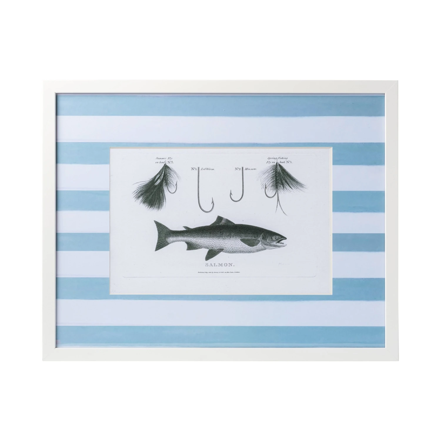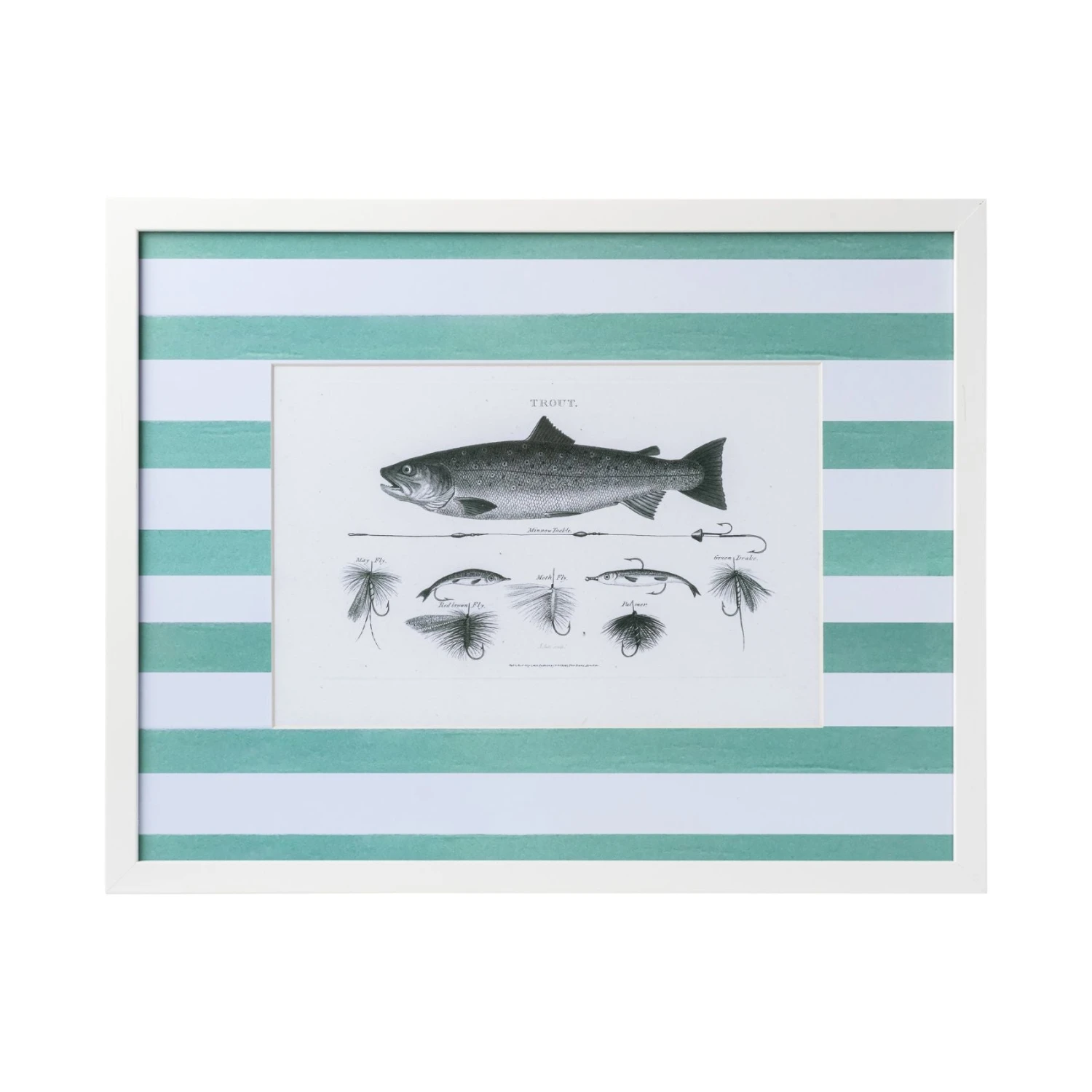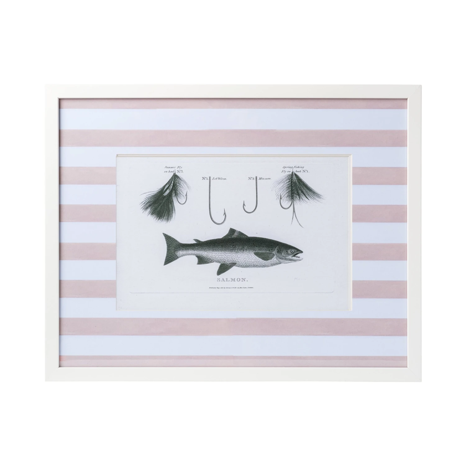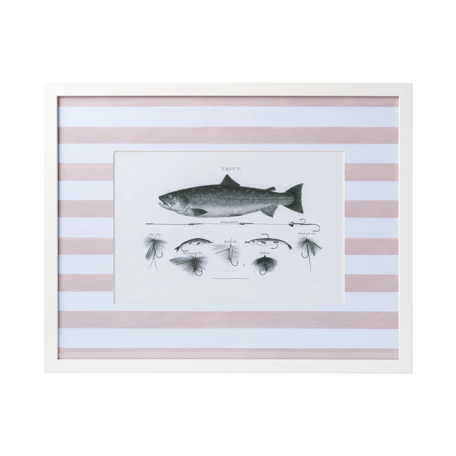 These vintage-inspired black and white fish prints showcase the trout and salmon species, bringing an outdoorsy feel to your space. Each print is accented with a striped mat—available in painterly blue, pink, or green—and finished in a custom white wood frame for a fresh, tailored look.