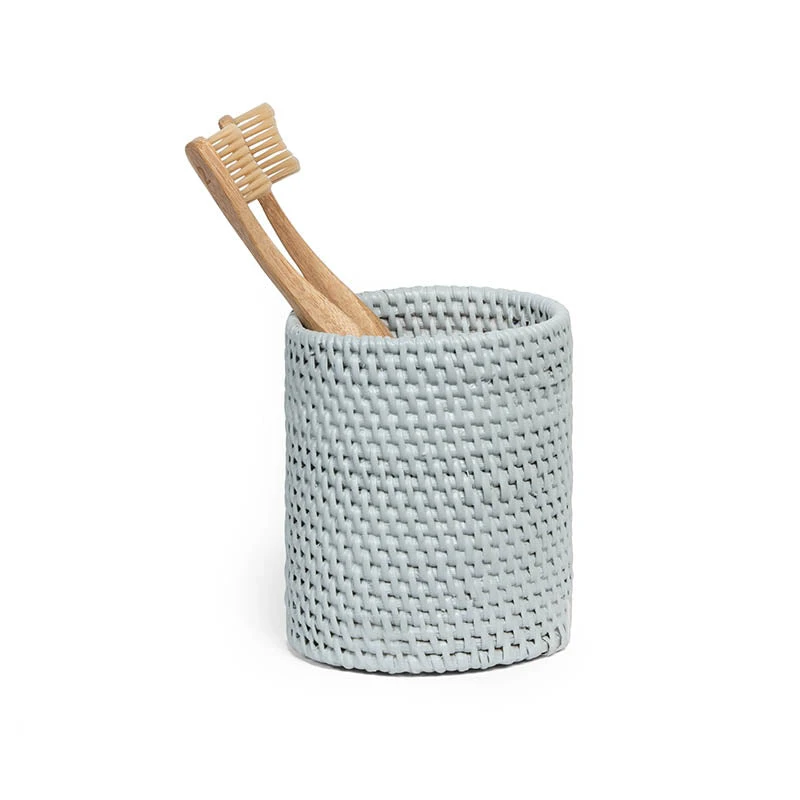 Organic dyes and detailed craftsmanship elevate our handmade Watch Hill rattan collection. Our Watch Hill Toothbrush Holder will add an elegant coastal touch to your bathroom counter. This toothbrush holder also doubles as an ideal container for makeup brushes.