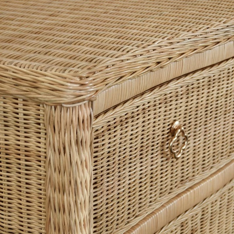 This four-drawer chest is beautifully crafted in woven rattan, exuding an organic, earthy charm. The drawers are adorned with satin brass pulls, adding a touch of refined luxury to the piece. Each drawer is equipped with soft-close glides, ensuring a smooth and quiet operation. The Watersound Dresser is not just a storage solution, it’s a statement piece that brings a sophisticated yet natural aesthetic to your bedroom or living space.