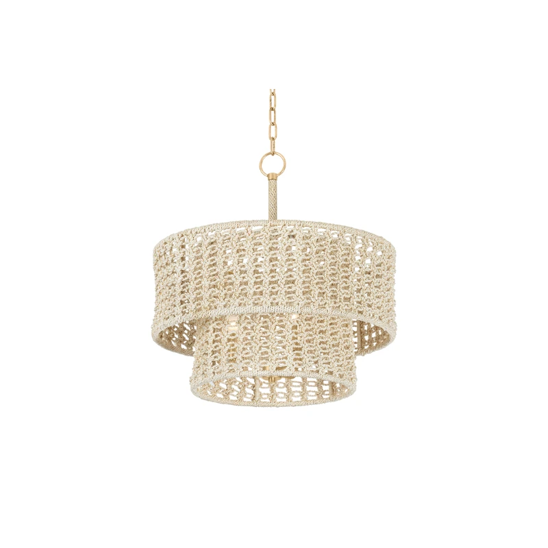Expertly handwoven from bleached abaca rope, our West Falmouth Pendant embodies bohemian elegance with its macramé-inspired design. This pendant lantern features a two-tiered structure adorned with classic drum shades that gently diffuse the light. Suspended from a Vintage Gold Leaf rod and chain, it adds a touch of coastal charm and airy sophistication to any space.