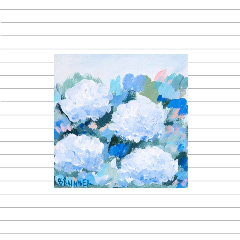 White Coastal Bloom I is part of our popular Mini Series of original 6″ x 6″ paintings by Ohio-based artist Michelle Brunner. This one-of-a-kind piece features a lush cluster of white hydrangeas in full bloom – capturing the joy and vibrancy of summer through Michelle’s signature impressionist style.