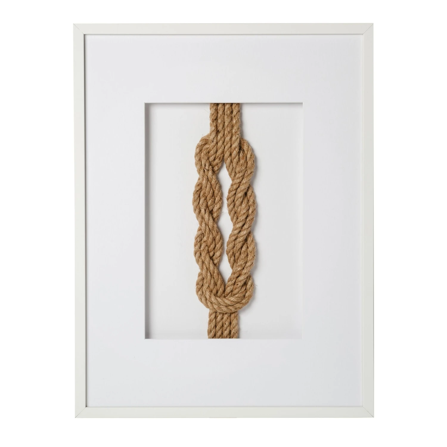 From the double carrick bend to the double figure eight, these hand-tied sailing knots are a showstopper. Each piece is made from natural rope and tied with perfect form. These unique knots come mounted on a white mat board and can be styled alone or as a pair or trio for a collected look.