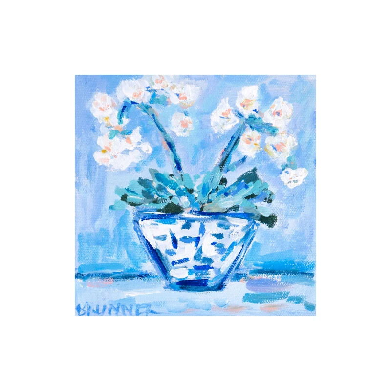 White Orchids II is part of our popular Mini Series of original 6″ x 6″ paintings by Ohio-based artist Michelle Brunner. This one-of-a-kind piece features elegant white orchids arranged in a blue-and-white chinoiserie planter, set against a soft blue backdrop. A delicate balance of form, color, and calm – painted in Michelle’s signature impressionistic style.