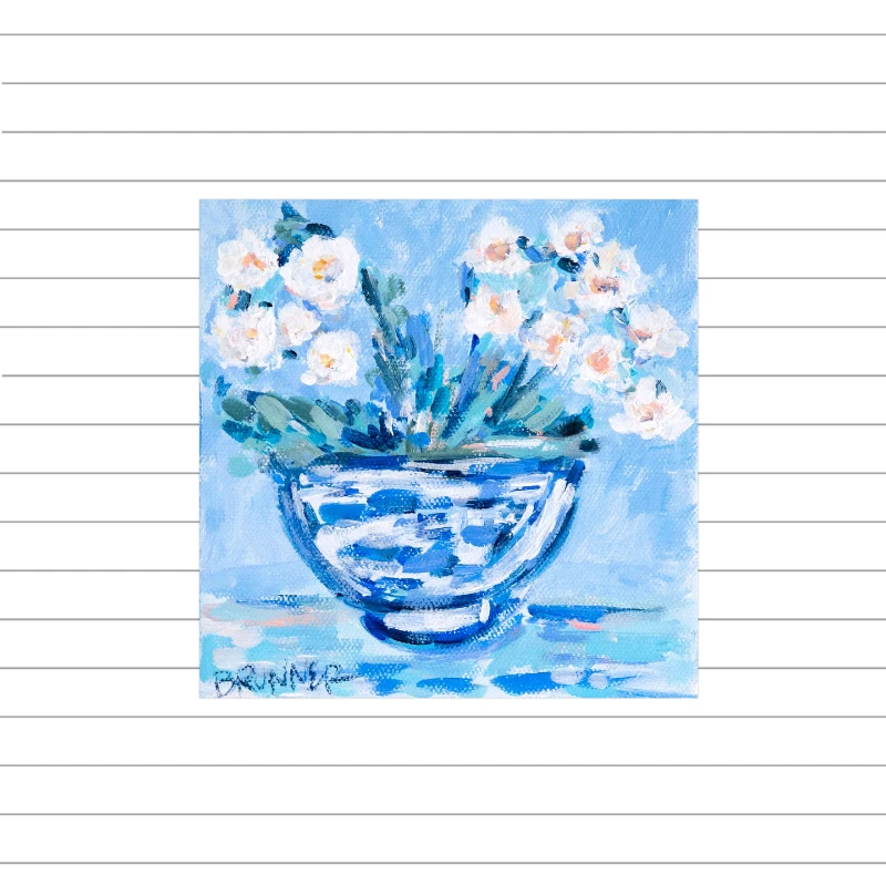 White Orchids IV is part of our popular Mini Series of original 6″ x 6″ paintings by Ohio-based artist Michelle Brunner. This one-of-a-kind piece features elegant white orchids arranged in a blue-and-white chinoiserie bowl, set against a soft blue backdrop. A delicate balance of form, color, and calm – painted in Michelle’s signature impressionistic style.