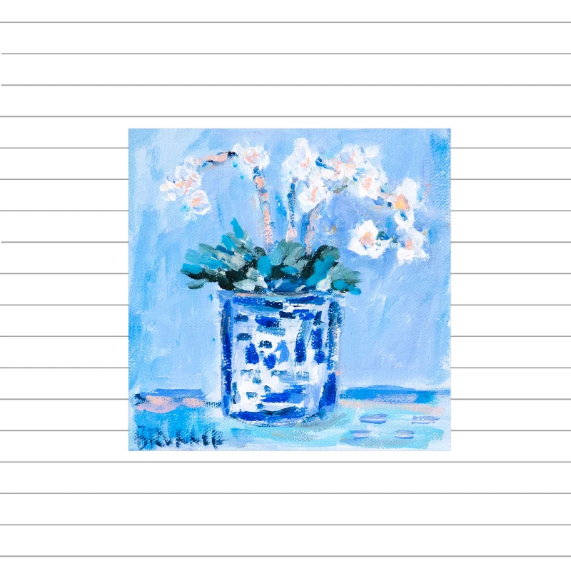 White Orchids VI is part of our popular Mini Series of original 6″ x 6″ paintings by Ohio-based artist Michelle Brunner. This one-of-a-kind piece features elegant white orchids arranged in a blue-and-white chinoiserie cachepot, set against a soft blue backdrop. A delicate balance of form, color, and calm – painted in Michelle’s signature impressionistic style.